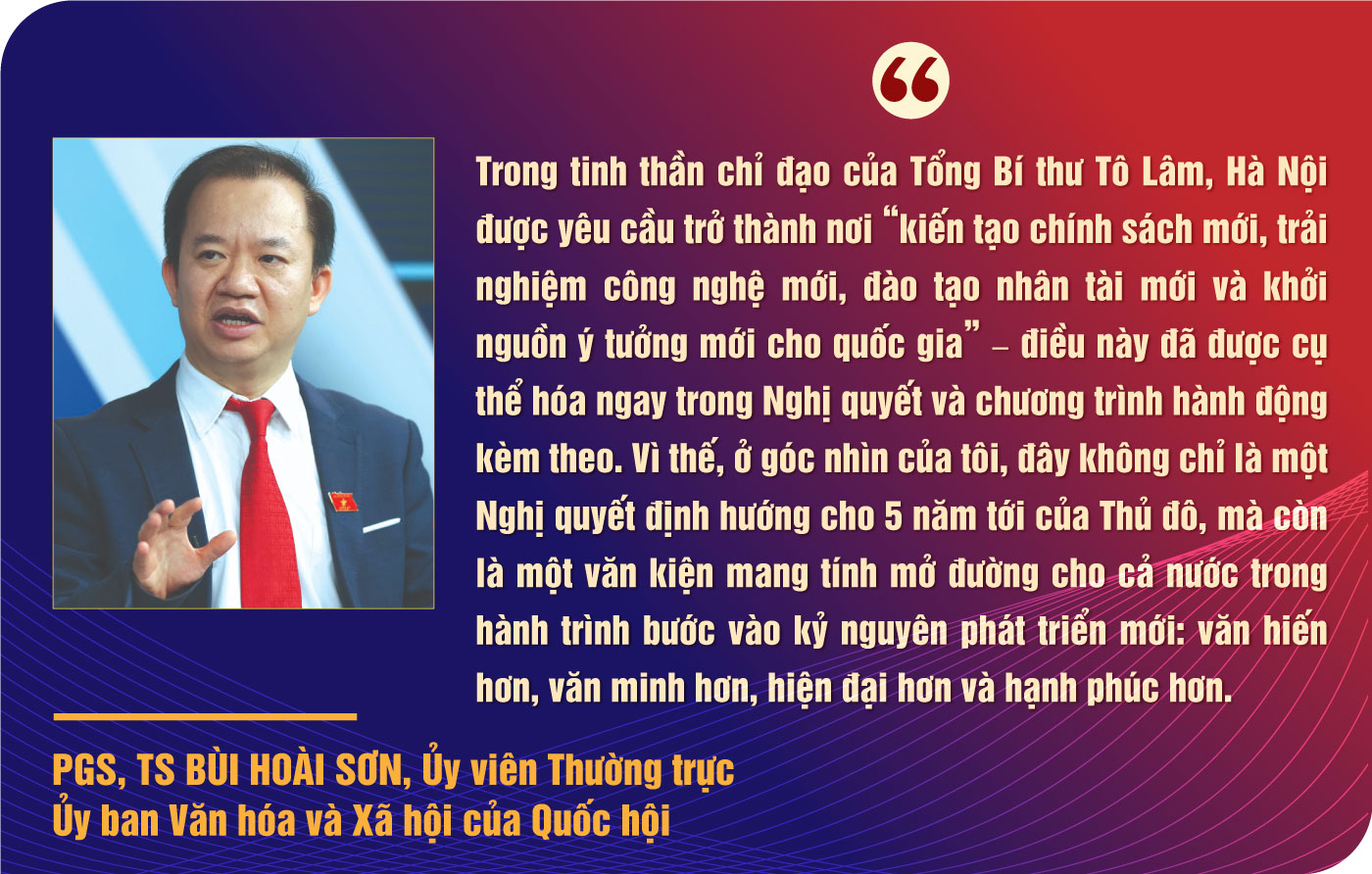 PGS, TS Bùi Hoài Sơn, Ủy viên Thường trực Ủy ban Văn hóa và Xã hội của Quốc hội: Theo tôi, Nghị quyết Đại hội là một văn kiện có tầm nhìn chiến lược, được chuẩn bị rất công phu, thể hiện rõ bản lĩnh và khát vọng vươn lên của Thủ đô trong kỷ nguyên mới. Trước hết, chủ đề Đại hội-“Phát huy truyền thống ngàn năm văn hiến và anh hùng; đoàn kết xây dựng đảng bộ trong sạch, vững mạnh; tiên phong, đột phá trong kỷ nguyên mới; phát triển Thủ đô văn minh, hiện đại, hạnh phúc” – đã nói rất cô đọng “linh hồn” của Nghị quyết: Đặt Hà Nội vào đúng vị trí một trung tâm chính trị, văn hóa, kinh tế của cả nước, đồng thời phải đi đầu về đổi mới tư duy, dám đột phá, dám gánh trách nhiệm tiên phong cho cả nước.