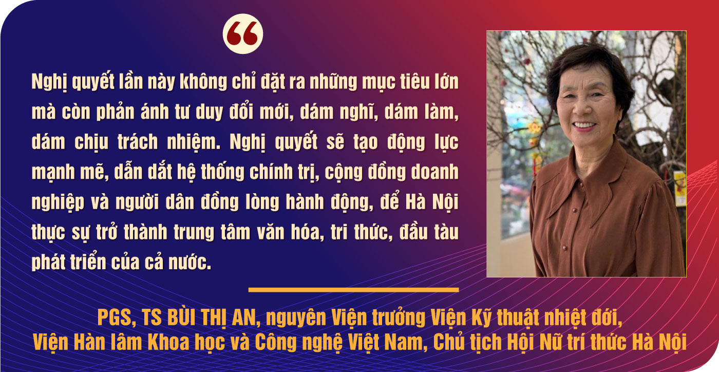 PGS, TS Bùi Thị An, nguyên Viện trưởng Viện Kỹ thuật nhiệt đới, Viện Hàn lâm Khoa học và Công nghệ Việt Nam, Chủ tịch Hội Nữ trí thức Hà Nội: Nghị quyết Đại hội có ý nghĩa đặc biệt quan trọng, mang tính định hướng chiến lược cho sự phát triển của Thủ đô trong giai đoạn 2025-2030 và tầm nhìn xa hơn. Hà Nội đang đứng trước yêu cầu mới của thời kỳ hội nhập sâu rộng, chuyển đổi số mạnh mẽ, cũng như đòi hỏi ngày càng cao về chất lượng sống của người dân. Vì vậy, việc Đại hội thống nhất một hệ mục tiêu mang tính đột phá, ưu tiên cho phát triển bền vững, xây dựng con người làm trung tâm, chính là bước khẳng định quyết tâm chính trị rất lớn của Đảng bộ TP.