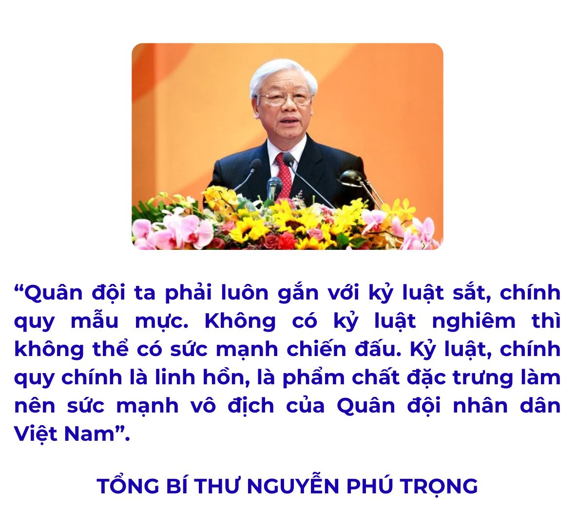 Trong một buổi làm việc với Quân ủy Trung ương (tháng 5 - 2023), Tổng Bí thư Nguyễn Phú Trọng, Bí thư Quân ủy Trung ương, đã nhấn mạnh: “Quân đội ta phải luôn gắn với kỷ luật sắt, chính quy mẫu mực. Không có kỷ luật nghiêm thì không thể có sức mạnh chiến đấu. Kỷ luật, chính quy chính là linh hồn, là phẩm chất đặc trưng làm nên sức mạnh vô địch của Quân đội nhân dân Việt Nam”.