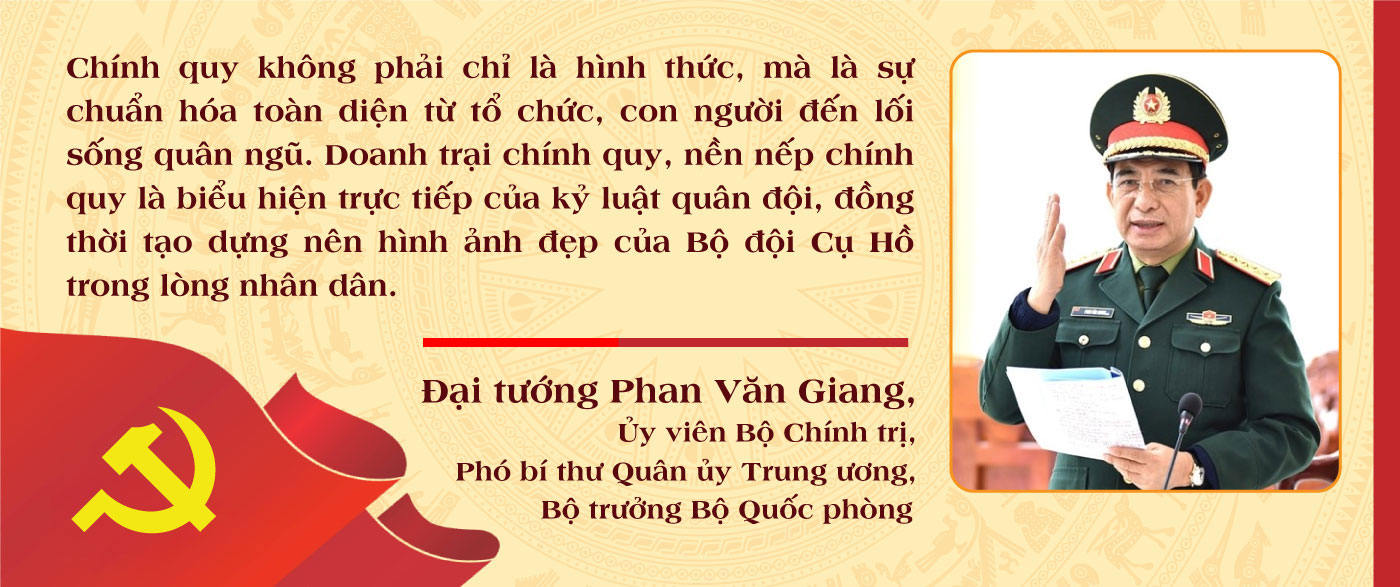 Đại tướng Phan Văn Giang, Ủy viên Bộ Chính trị, Phó bí thư Quân ủy Trung ương, Bộ trưởng Bộ Quốc phòng khẳng định: “Chính quy không phải chỉ là hình thức, mà là sự chuẩn hóa toàn diện từ tổ chức, con người đến lối sống quân ngũ. Doanh trại chính quy, nền nếp chính quy là biểu hiện trực tiếp của kỷ luật quân đội, đồng thời tạo dựng nên hình ảnh đẹp của Bộ đội Cụ Hồ trong lòng nhân dân”.
