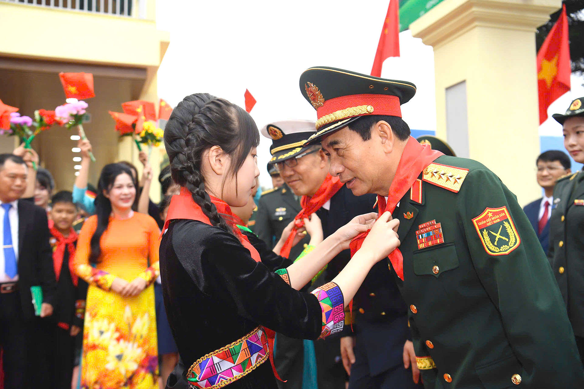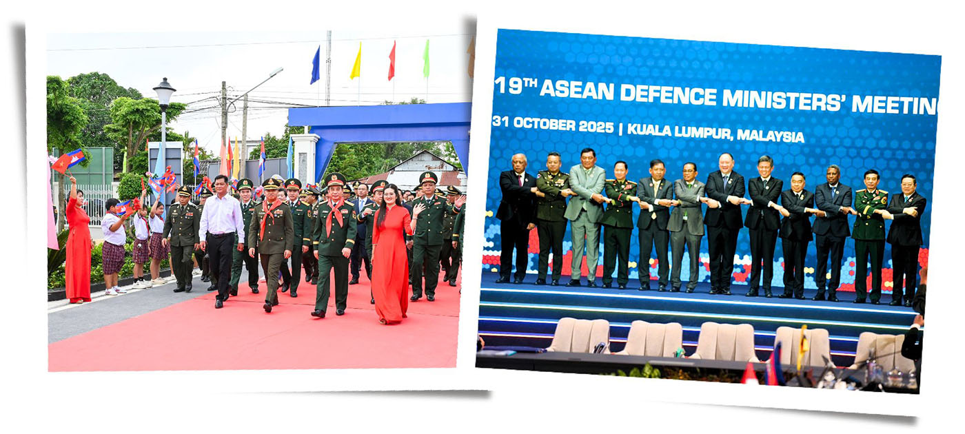 Ảnh trái: Thầy cô và học sinh Trường tiểu học Bến Cầu (tỉnh Tây Ninh) chào đón Đại tướng Phan Văn Giang, Bộ trưởng Bộ Quốc phòng Việt Nam và Đại tướng Tea Seiha, Phó thủ tướng, Bộ trưởng Bộ Quốc phòng Campuchia trong khuôn khổ Giao lưu hữu nghị quốc phòng biên giới Việt Nam-Campuchia lần thứ 2, tháng 11-2025. Ảnh: XUÂN CƯỜNG. Ảnh phải: Đại tướng Phan Văn Giang cùng các đại biểu dự Hội nghị Bộ trưởng Quốc phòng các nước ASEAN (ADMM) lần thứ 19 tại Kuala Lumpur (Malaysia), ngày 31-10-2025. Ảnh: THU TRANG