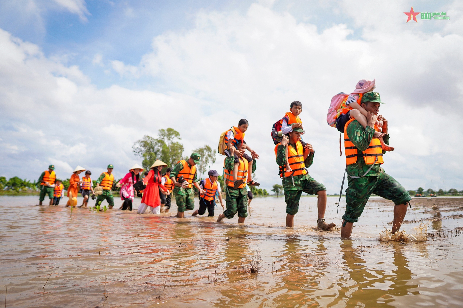 Cán bộ, chiến sĩ Bộ đội Biên phòng tỉnh An Giang cõng trên vai ước mơ đến trường của trẻ em vùng biên vào mùa nước nổi.