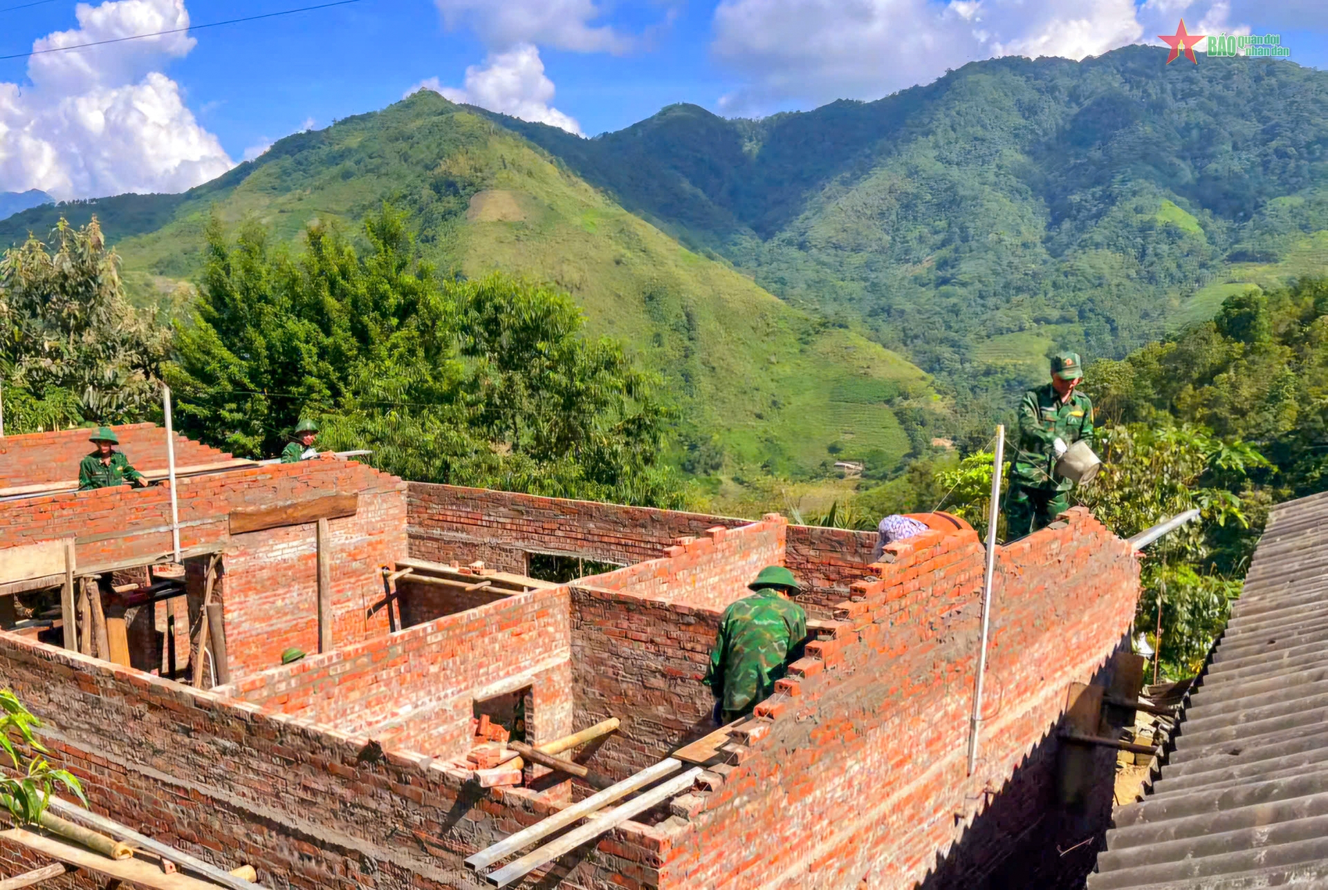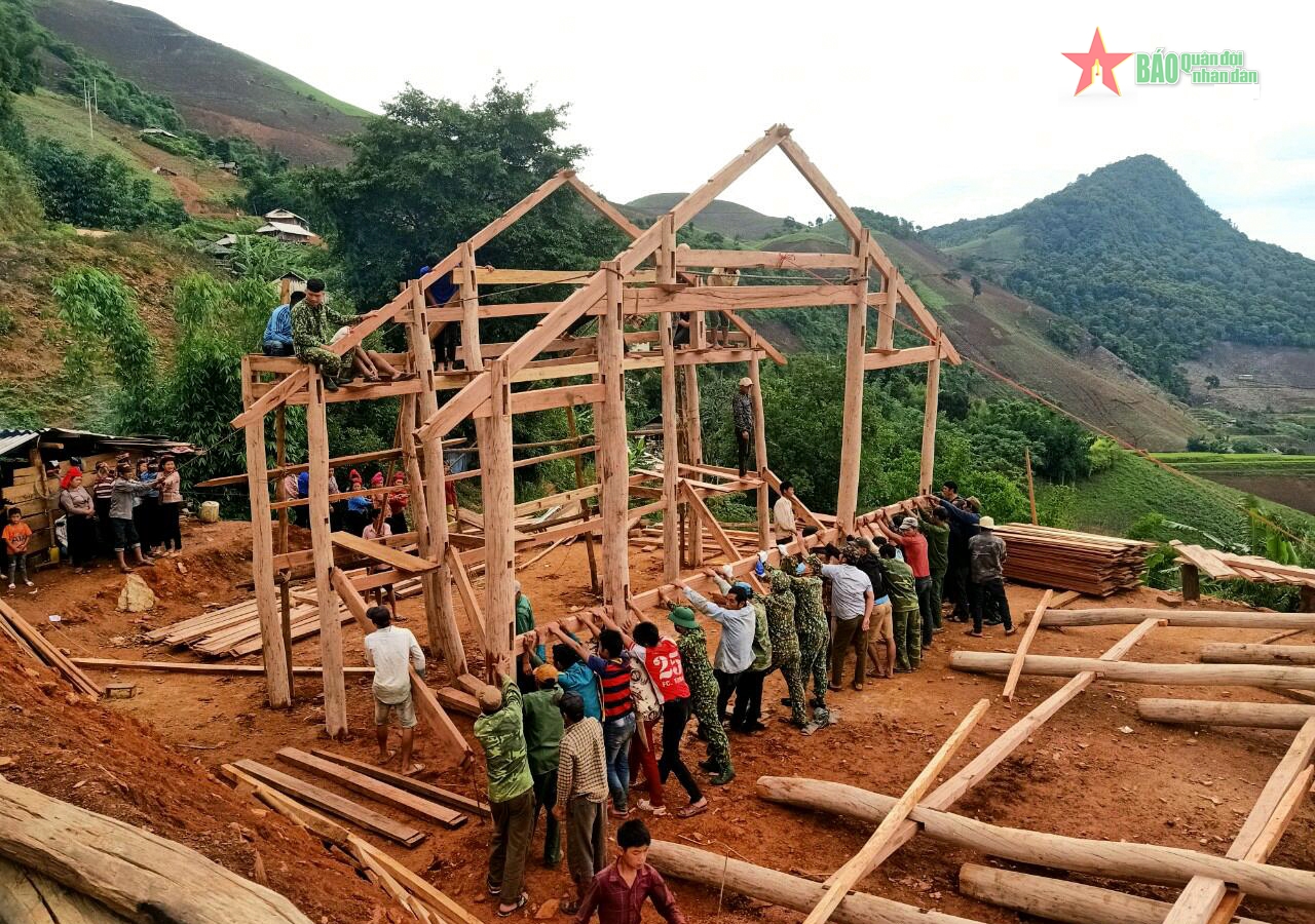 Cán bộ, chiến sĩ Đồn Biên phòng Phiêng Pằn (Ban chỉ huy Bộ đội Biên phòng tỉnh Sơn La) hỗ trợ nhân dân dựng nhà mới.