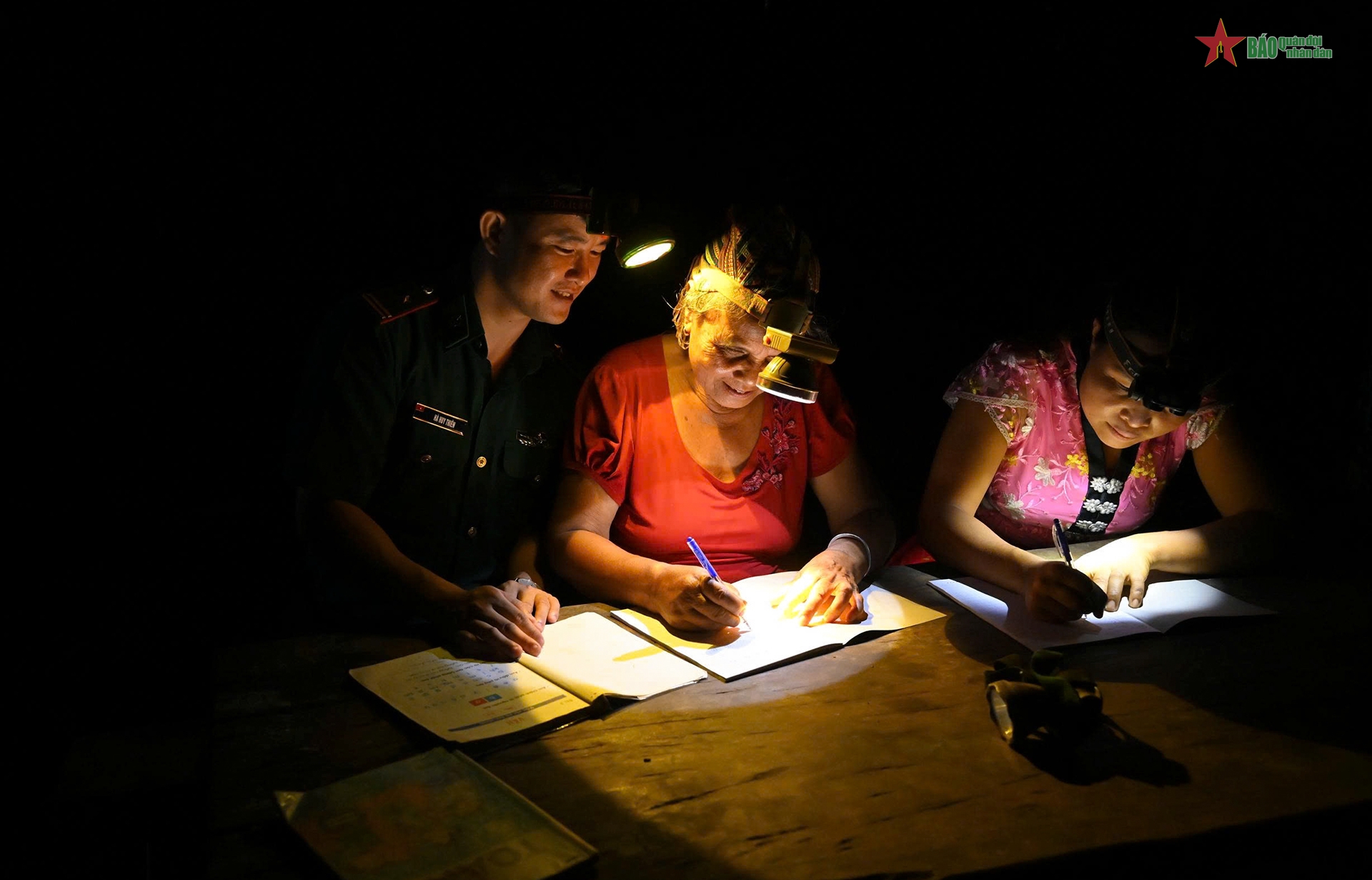 Cán bộ Đồn Biên phòng Tam Hợp (Ban chỉ huy Bộ đội Biên phòng tỉnh Nghệ An) giúp người dân học chữ trong điều kiện thiếu đèn điện.