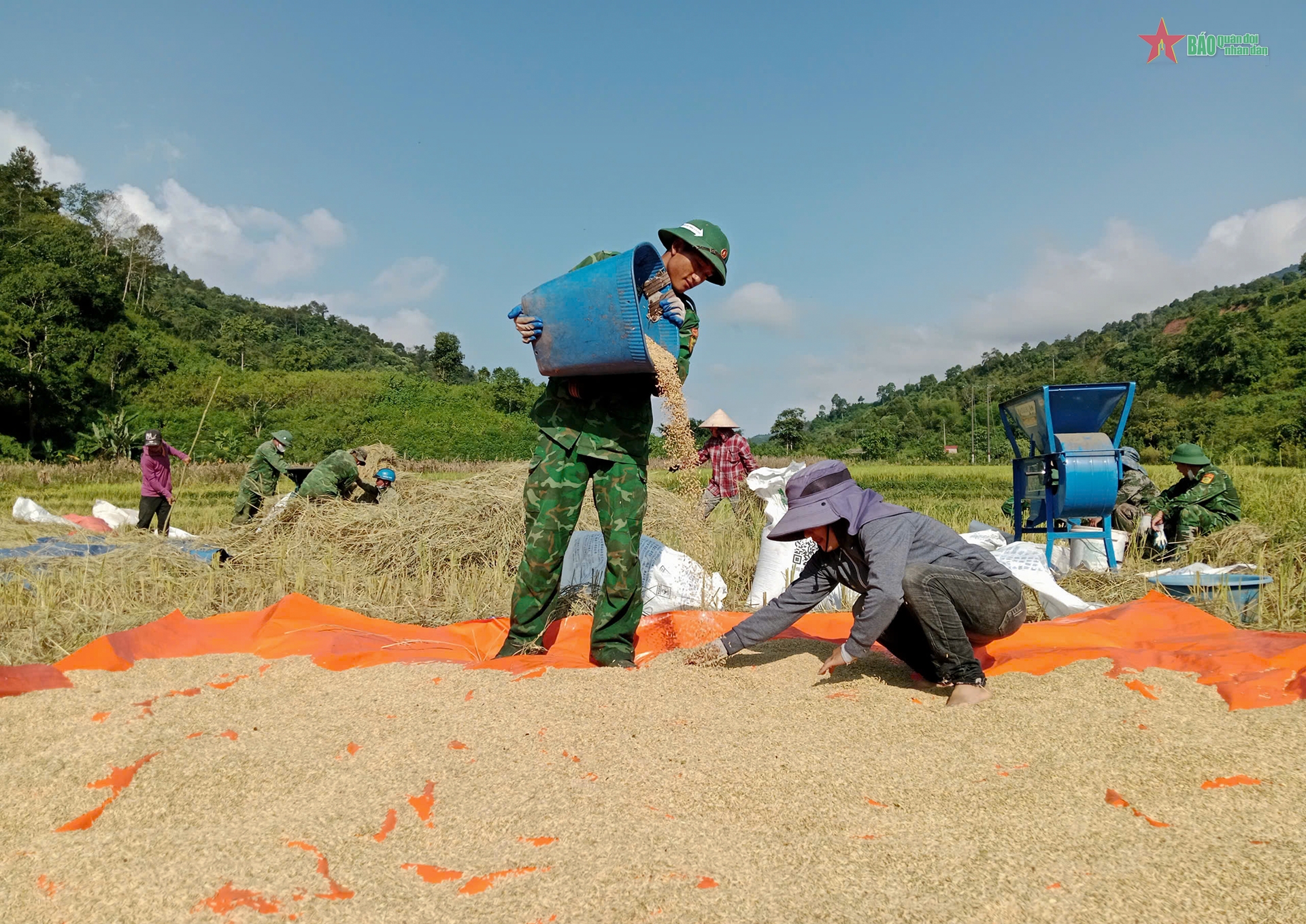 Chiến sĩ Đồn Biên phòng A Pa Chải (Ban chỉ huy Bộ đội Biên phòng tỉnh Điện Biên) giúp dân thu hoạch lúa.