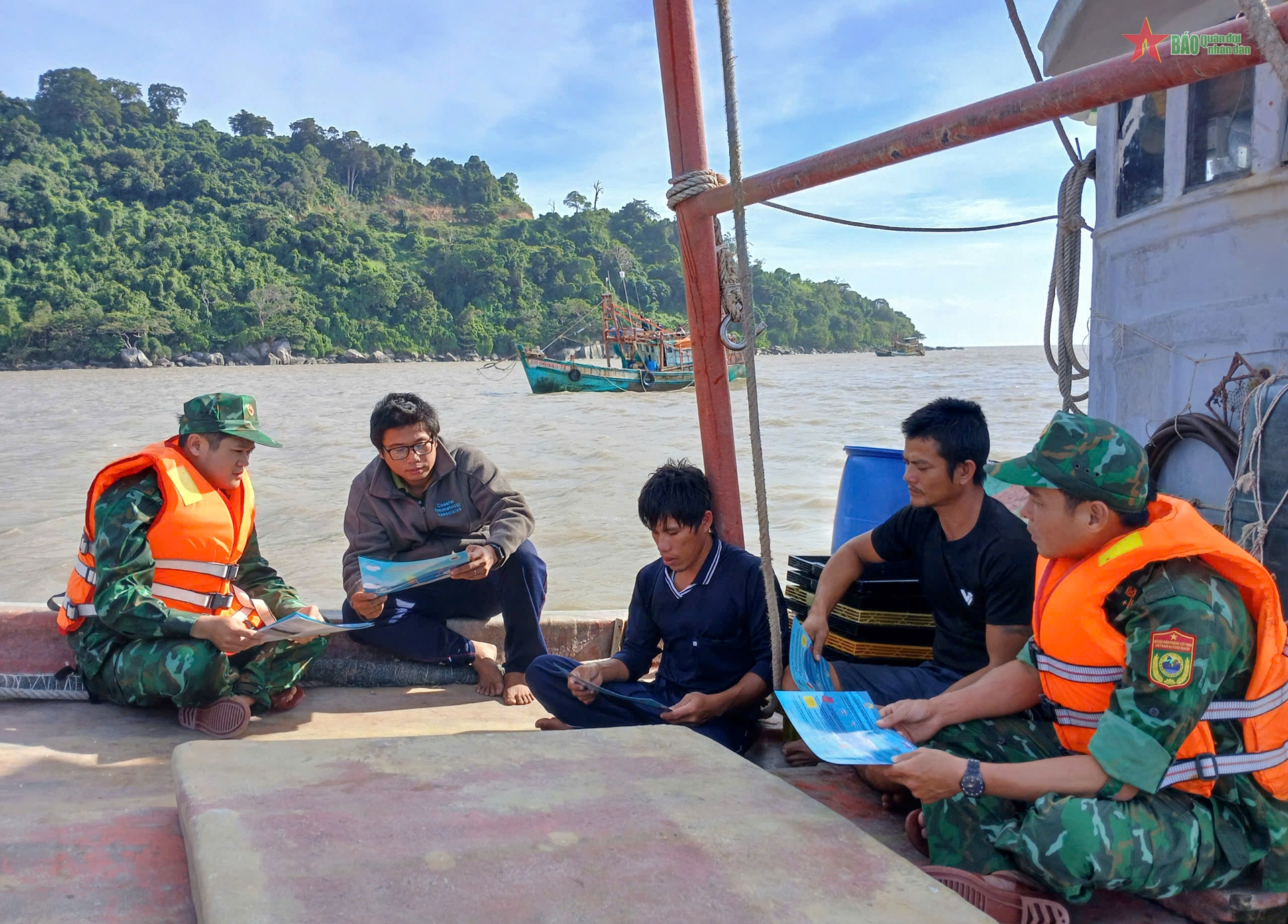 Cán bộ, chiến sĩ Đồn Biên phòng Hòn Khoai (Ban chỉ huy Bộ đội Biên phòng tỉnh Cà Mau) tuyên truyền, phổ biến pháp luật cho ngư dân.