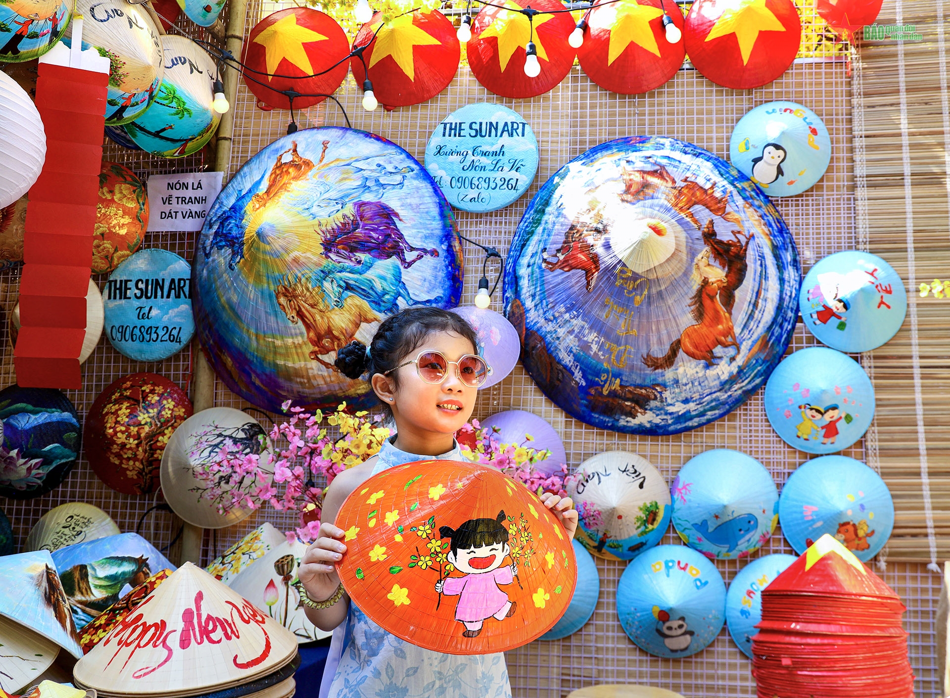 Các em nhỏ thích thú chụp ảnh lưu niệm bên những chiếc nón lá truyền thống, góp phần tạo nên sắc màu tươi vui của lễ hội.