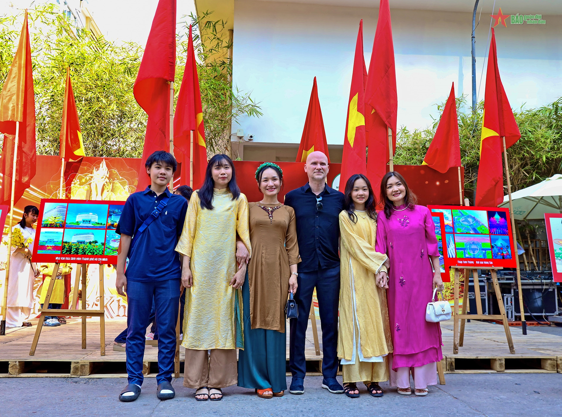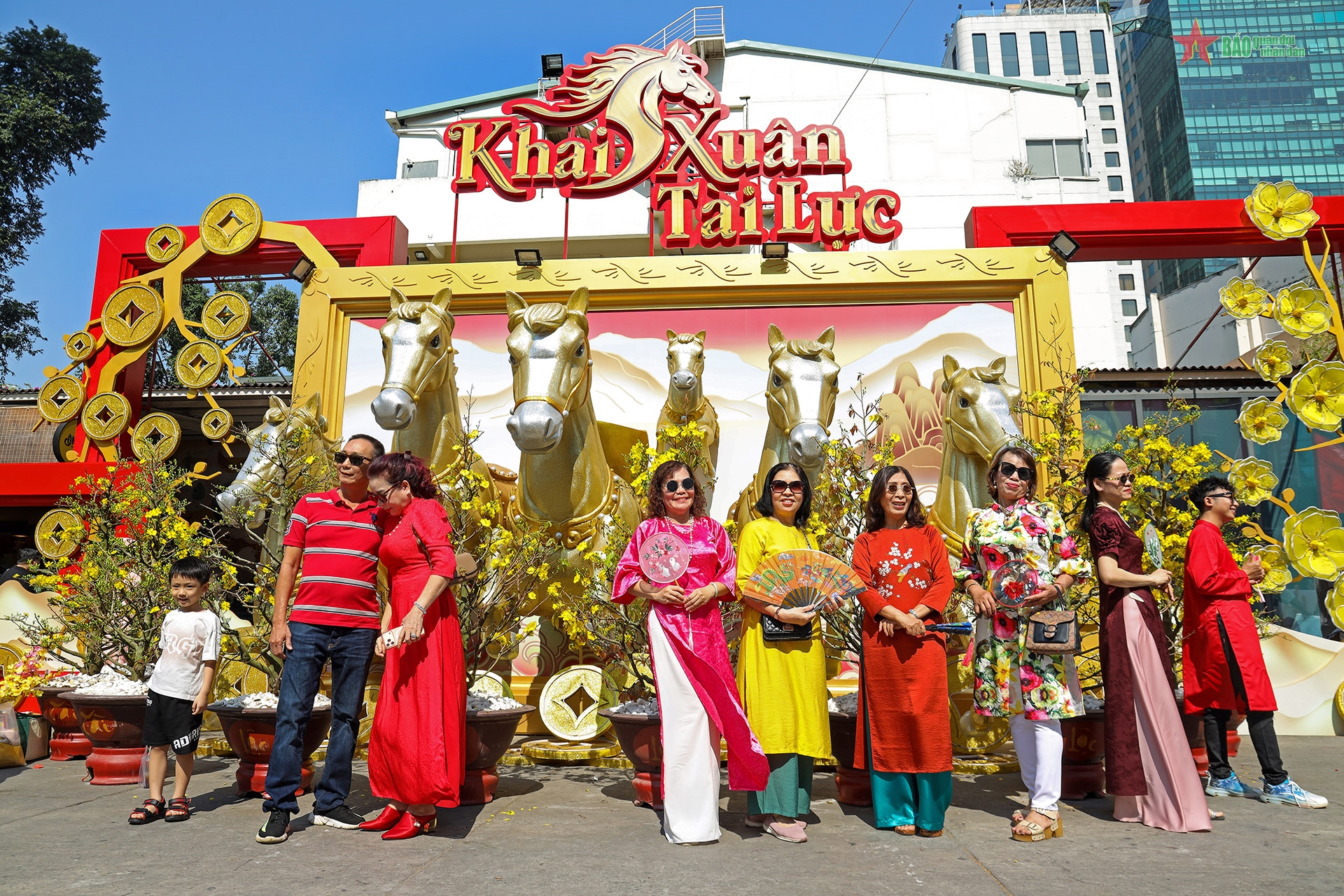 Trong dòng người du xuân, nhiều gia đình, bạn trẻ lựa chọn diện áo dài truyền thống, kết hợp quạt giấy, câu đối đỏ, lưu giữ những khoảnh khắc đầu năm mang đậm sắc xuân.