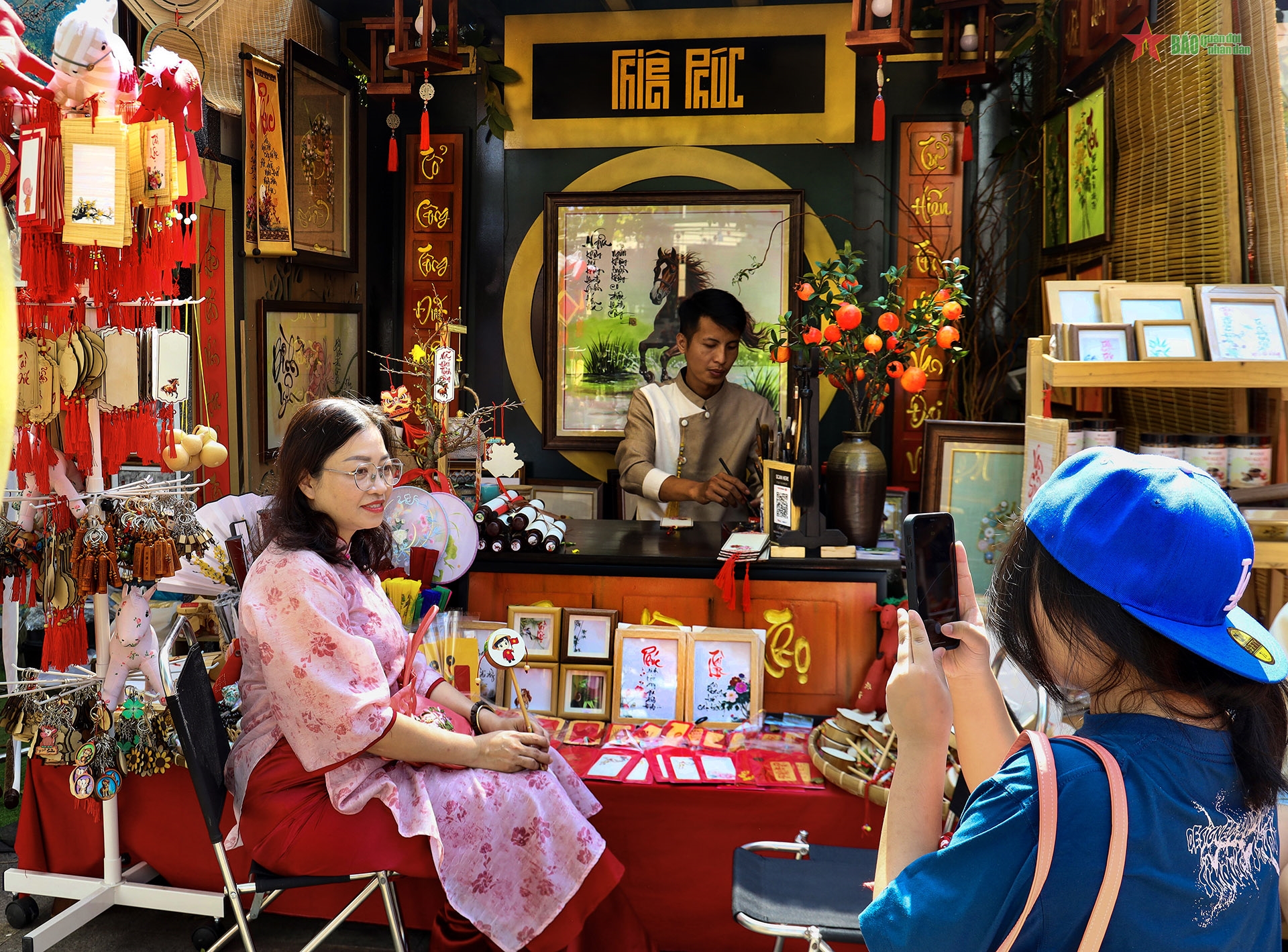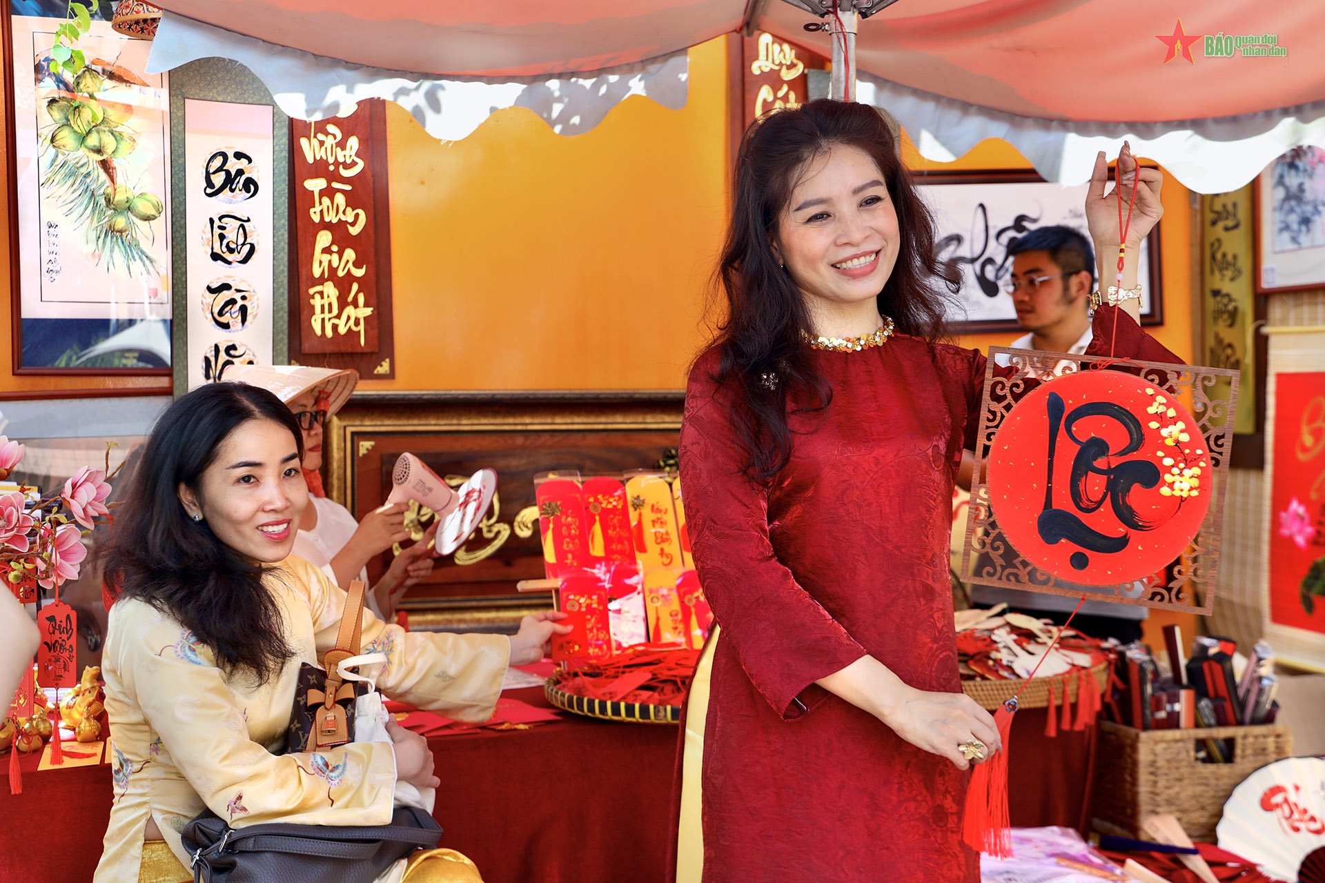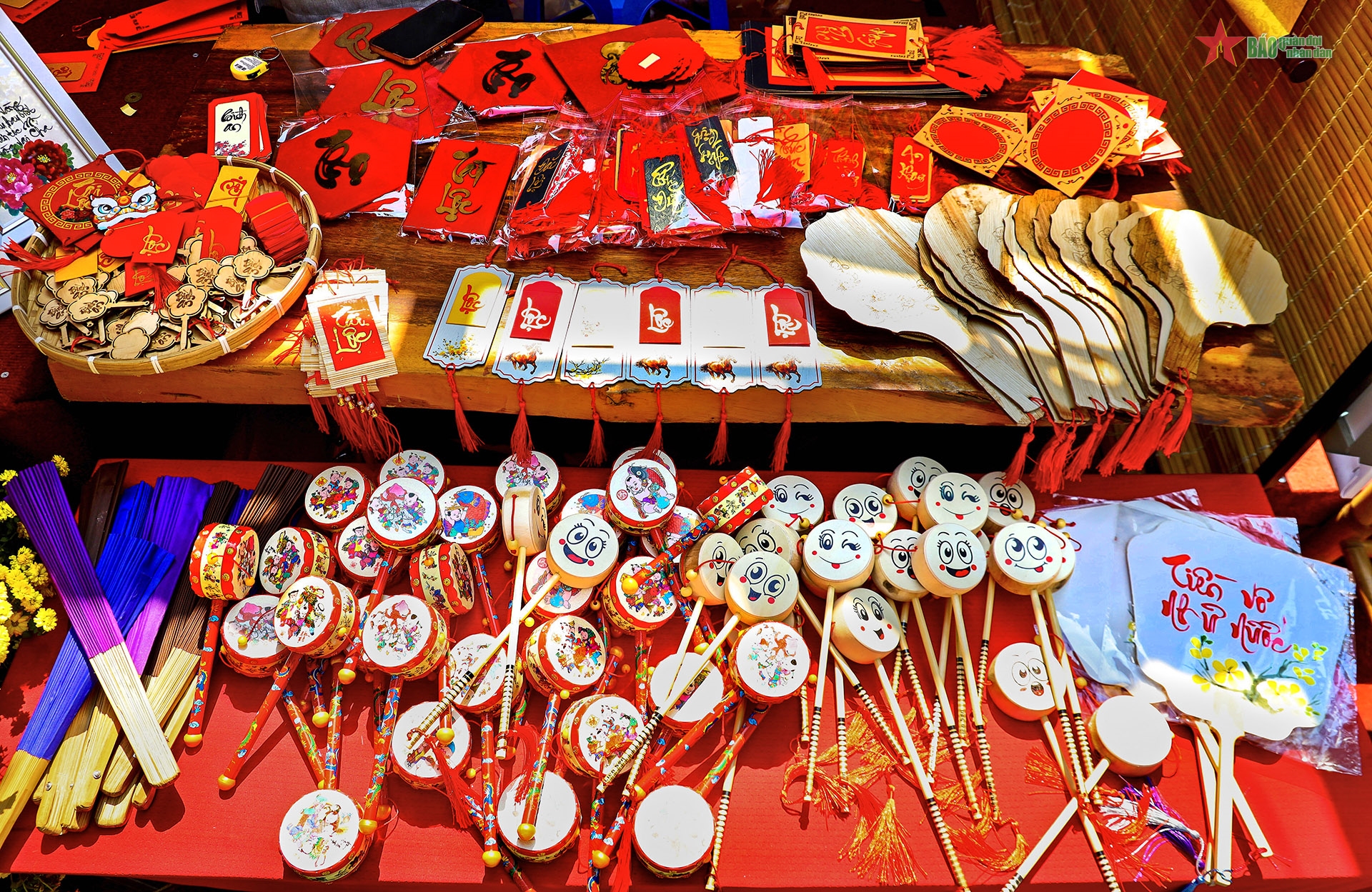 Bên cạnh thư pháp truyền thống, các gian hàng còn trưng bày nhiều sản phẩm thư pháp ứng dụng như bao lì xì, quạt giấy, mẹt, trống gỗ… tạo sự phong phú cho không gian lễ hội.
