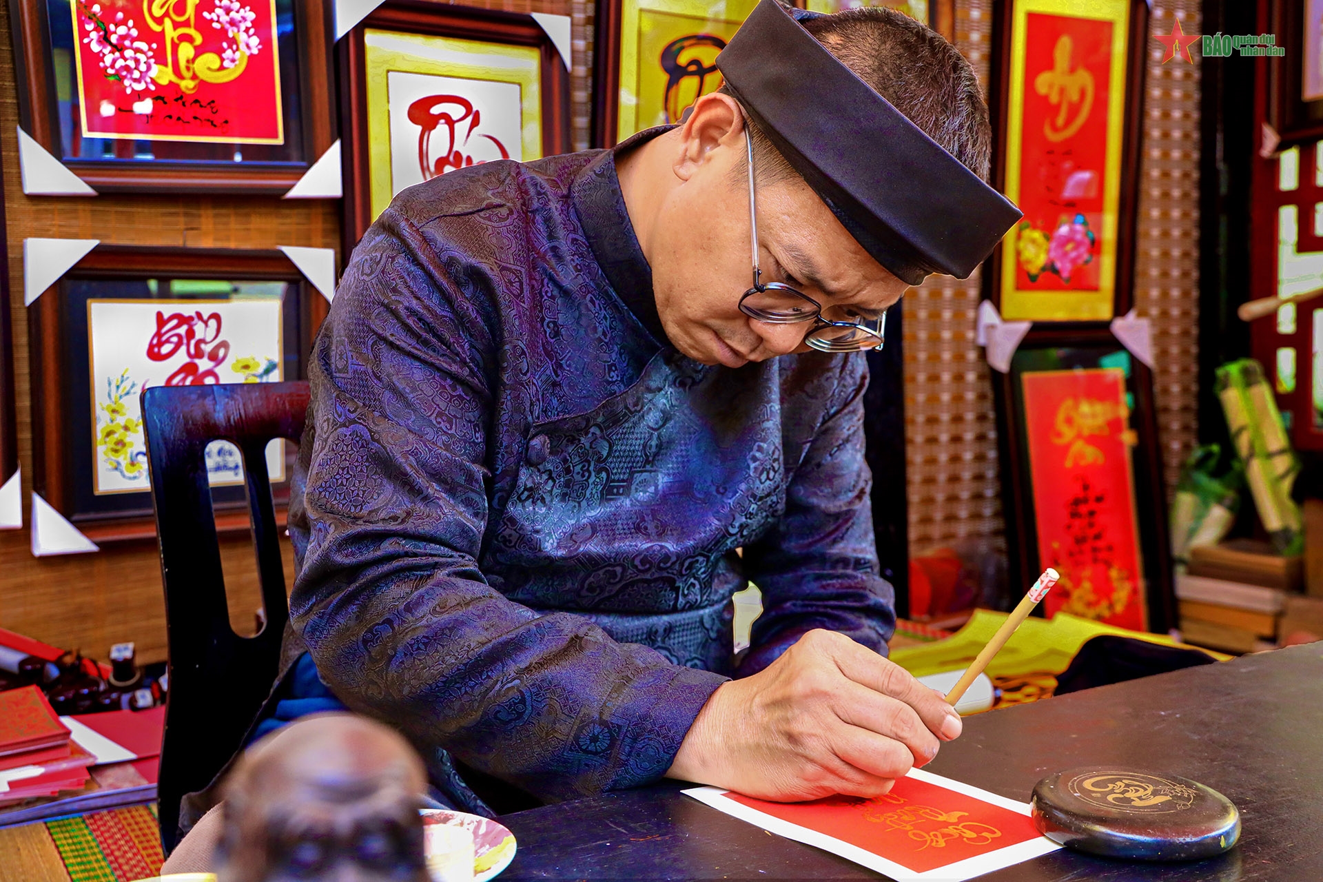 Ông đồ trong trang phục truyền thống chăm chú viết chữ, gợi lại không khí Tết xưa thân thuộc giữa lòng đô thị hiện đại.
