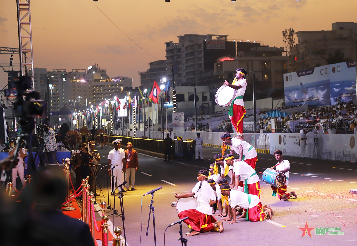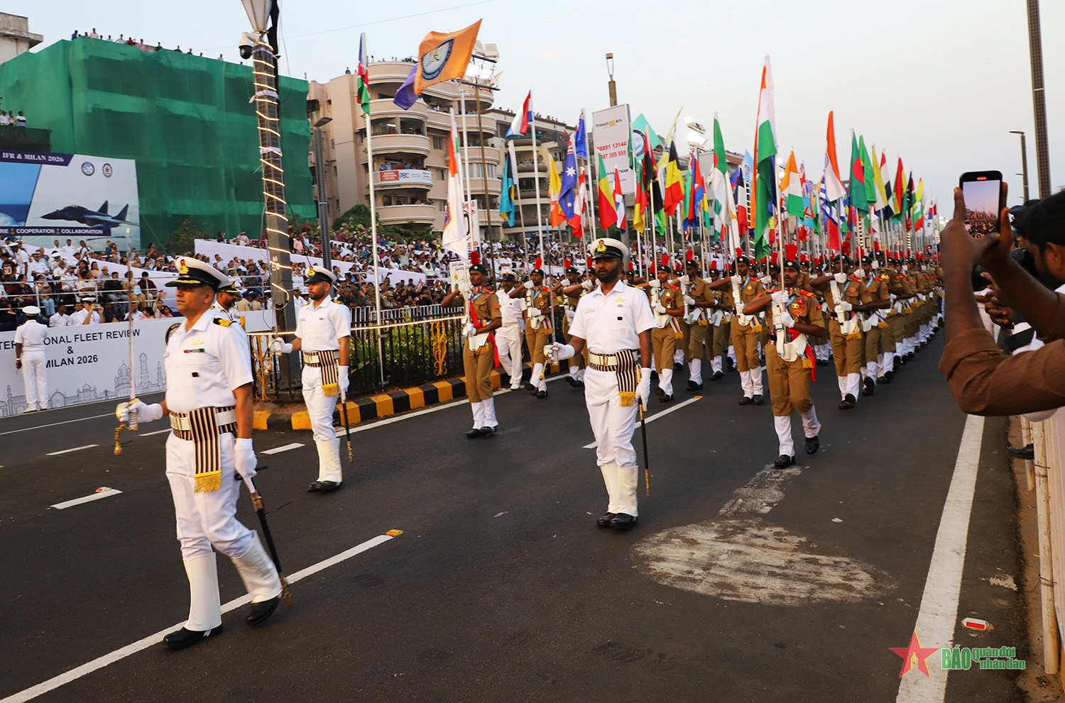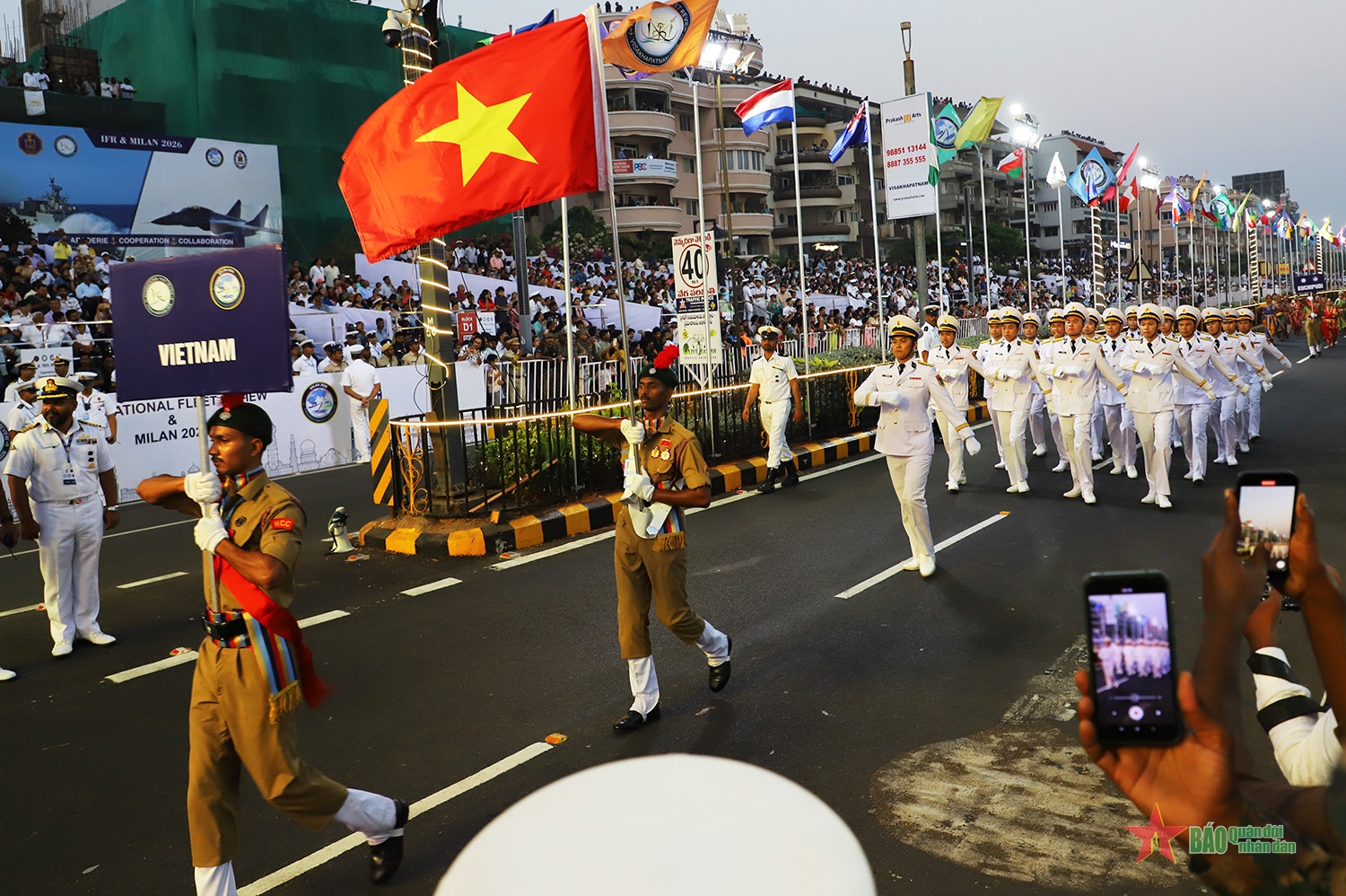 Nằm trong khuôn khổ các hoạt động tại bến của Diễn tập MILAN 2026, chiều 19-2, tại khu vực bờ biển thành phố Visakhapatnam, Ấn Độ, Lễ diễu binh quốc tế được tổ chức long trọng bởi màn trình diễn sức mạnh không quân và Lễ diễu binh đường phố, đậm đà bản sắc văn hóa.