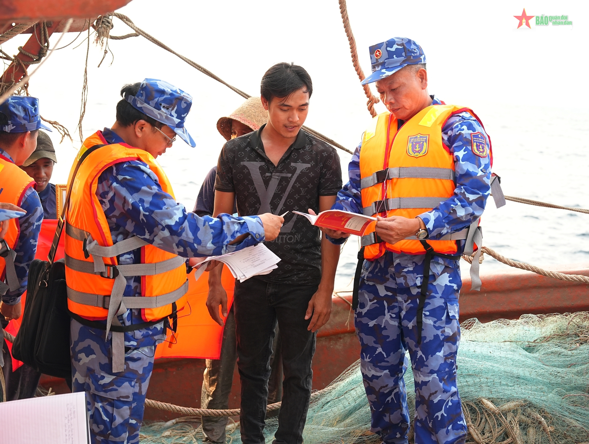 Tổ công tác kiểm tra nhật ký khai thác và sổ danh bạ thuyền viên của tàu cá KG 90923-TS.