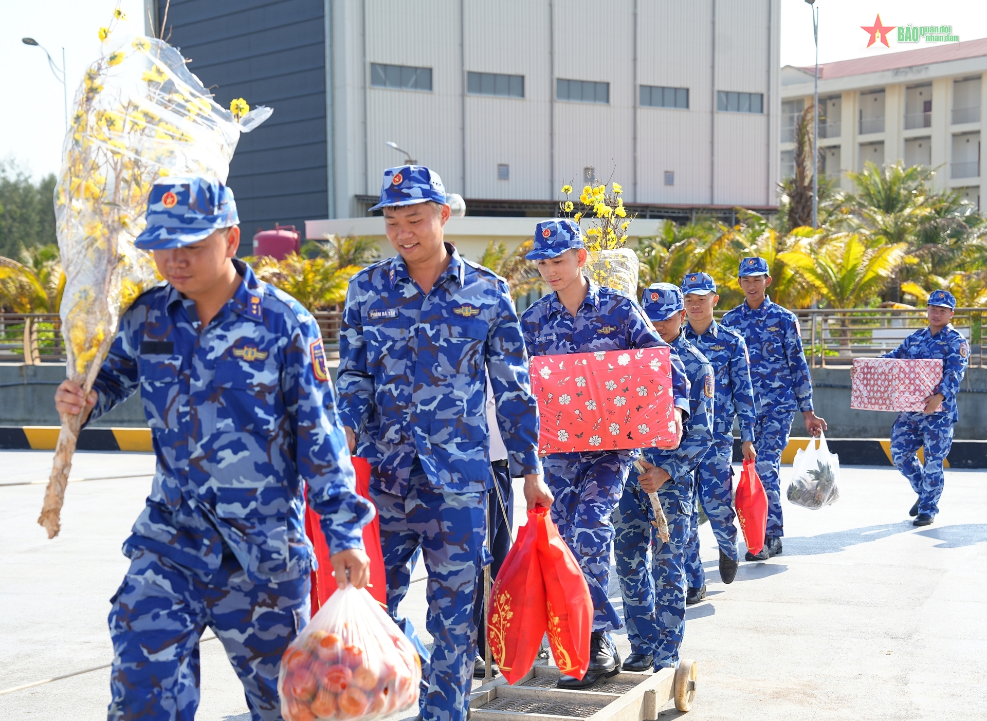 Những cành mai vàng và hộp quà Tết được chuẩn bị kỹ càng từ đất liền để gửi đến cán bộ, chiến sĩ các tàu đang thực hiện nhiệm vụ trực sẵn sàng chiến đấu trên biển.