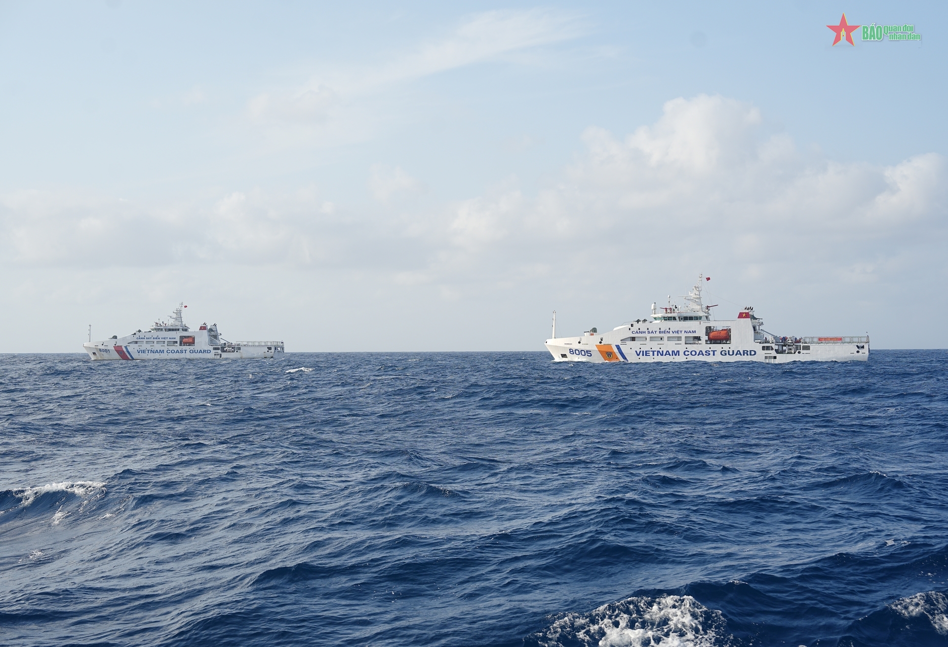 Tàu CSB 8005 tiếp cận tàu CSB 8001 đang thực hiện nhiệm vụ trên biển.