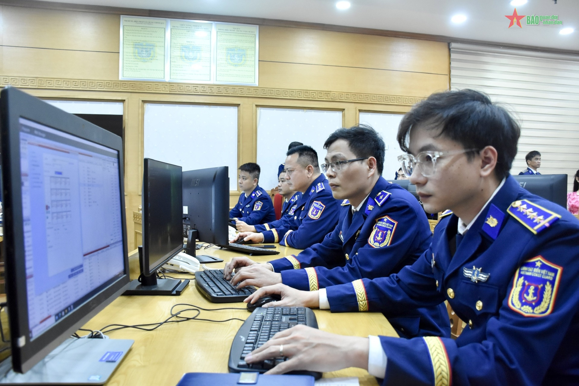 Cán bộ, chiến sĩ tại Trung tâm Chỉ huy Bộ tư lệnh Cảnh sát biển thực hiện nhiệm vụ.