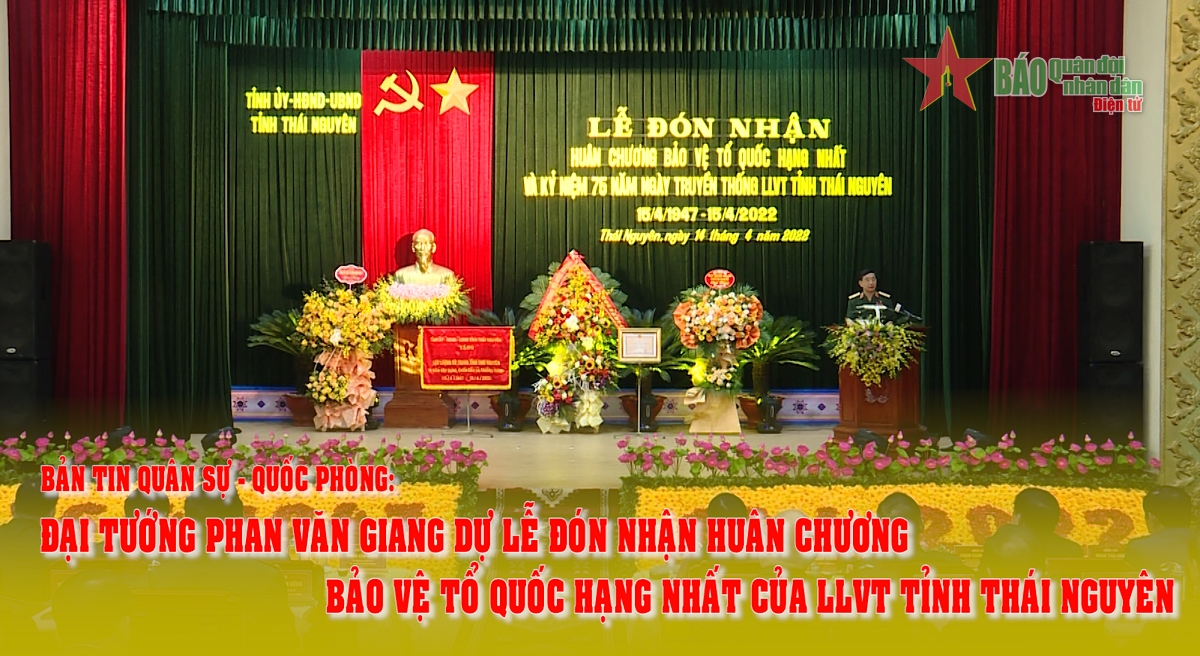 Nội dung chính: Đại tướng Phan Văn Giang dự lễ đón nhận Huân chương Bảo vệ Tổ quốc hạng Nhất của LLVT tỉnh Thái Nguyên; Thượng tướng Nguyễn Tân Cương chủ trì Hội nghị Ban soạn thảo Luật Phòng thủ dân sự