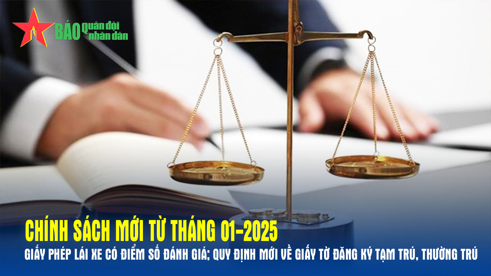 Từ tháng 01-2025, nhiều chính sách, quy định mới có hiệu lực như: Giấy phép lái xe có điểm số đánh giá; Giảm thuế giá trị gia tăng trong 6 tháng đầu năm; Bổ sung 3 chức danh thuộc đối tượng cảnh vệ; quy định mới về giấy tờ đăng ký tạm trú, thường trú...