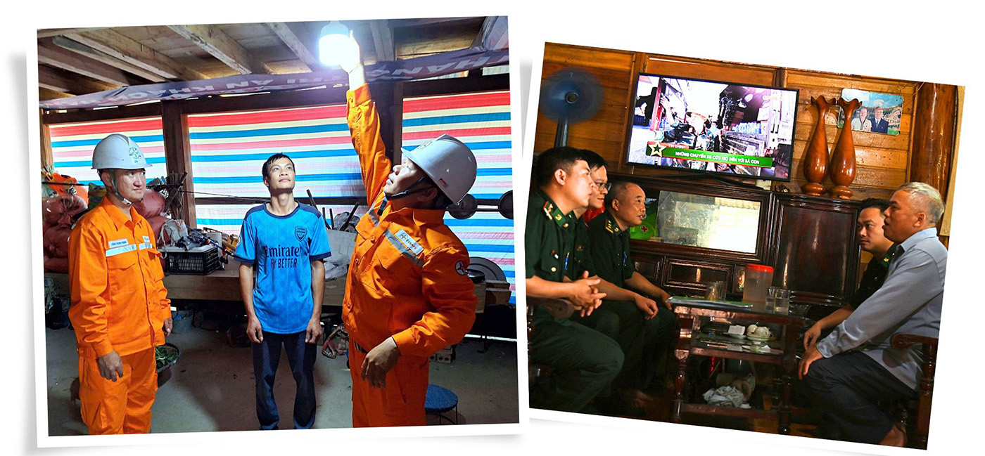 Ảnh phải: Có điện lưới quốc gia, bà con mua sắm ti vi, nâng cao đời sống tinh thần. Trong ảnh: Cán bộ Đồn Biên phòng Pa Tần, BĐBP tỉnh Lai Châu đến thăm, động viên gia đình ông Vàng Văn Ún, Bí thư Chi bộ bản Pa Tần 3 (xã Pa Tần). Nhiều nội dung được cán bộ Biên phòng tuyên truyền, giúp bà con phát triển kinh tế, tích cực tham gia bảo vệ chủ quyền, an ninh biên giới quốc gia.