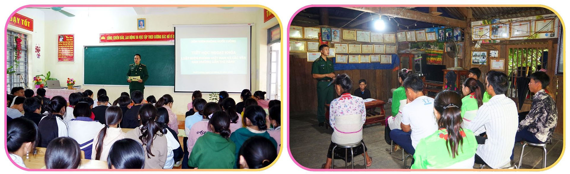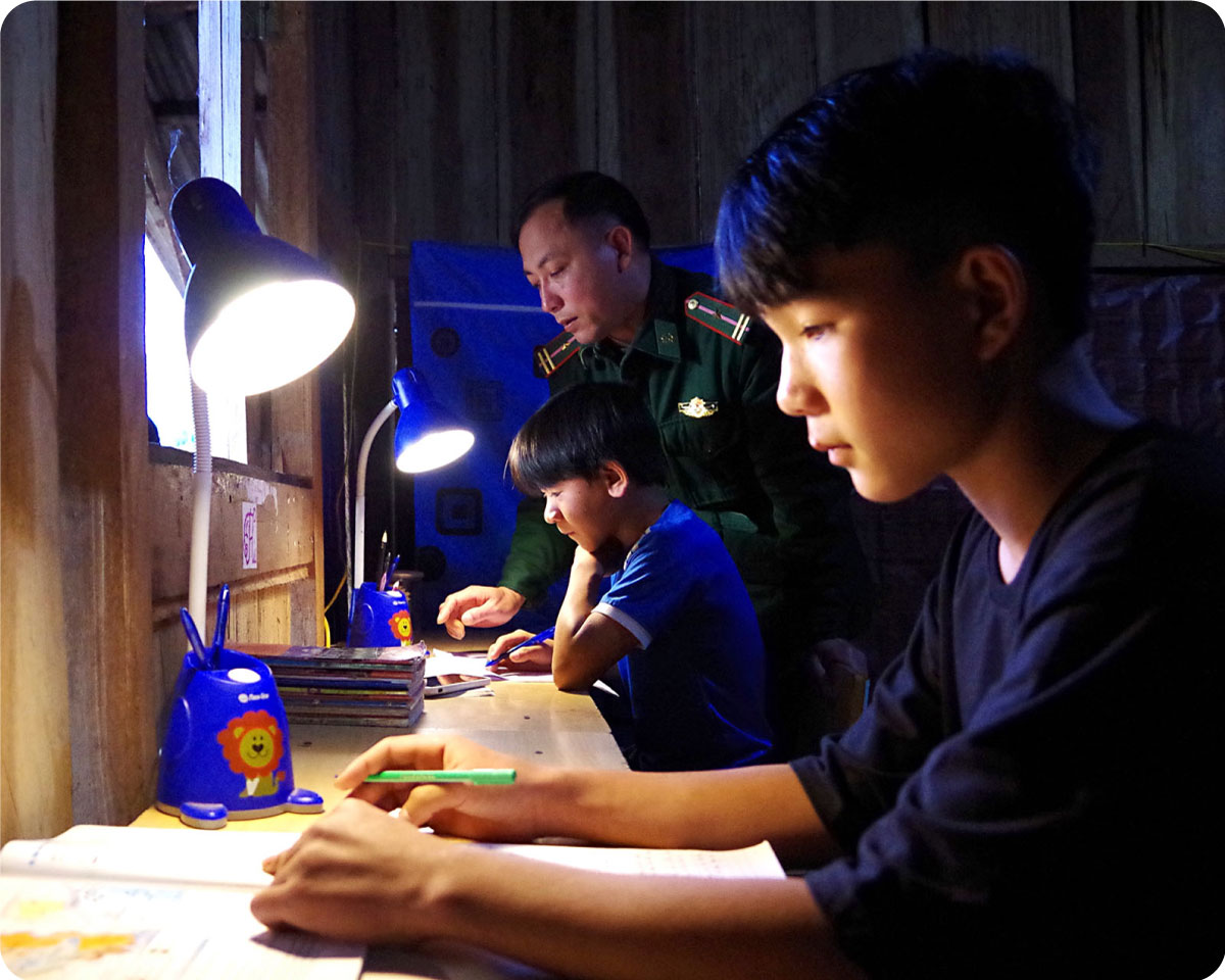 Ảnh trái: Học sinh trường THCS bán trú Huổi Luông (xã Phong Thổ), tỉnh Lai Châu được học tập trong ánh sáng của điện lưới quốc gia, với sự hỗ trợ của nhiều phương tiện hiện đại. Trong ảnh: Đại úy Phan Thành Nam, cán bộ Đồn biên phòng Huổi Luông, Ban Chỉ huy BĐBP Lai Châu lên lớp trong Tiết học biên cương, tuyên truyền về Luật Biên phòng, công tác bảo vệ rừng, không nghe theo kẻ xấu...