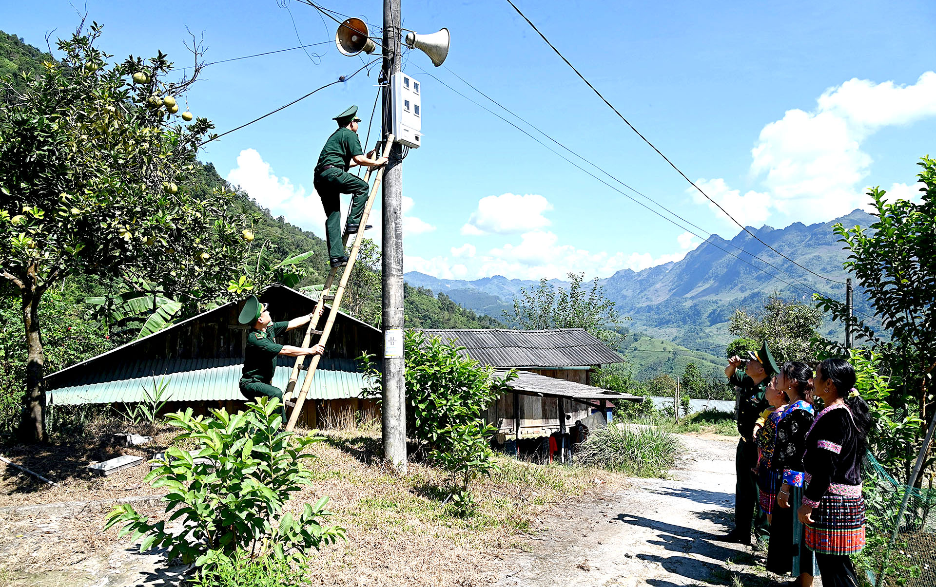 Thời điểm hiện tại, điện lưới quốc gia đã đến được 11/11 xã biên giới của tỉnh Lai Châu, trong đó 88,7% số thôn, bản có điện. Nhờ có điện lưới, tiếng loa Biên phòng sớm, chiều vang lên nơi biên cương Tổ quốc. Tiếng loa như tiếng nói ân tình của Đảng, Nhà nước và Quân đội; nhờ có tiếng loa biên phòng, mọi chủ trương, chính sách Đảng, Nhà nước đến được với đồng bào nhanh nhất, sớm nhất... Trong ảnh: Cán bộ Đồn Biên phòng Pa Tần, Bộ đội Biên phòng Lai Châu mắc cụm loa truyền thanh tại bản Pho 1, xã Pa Tần.