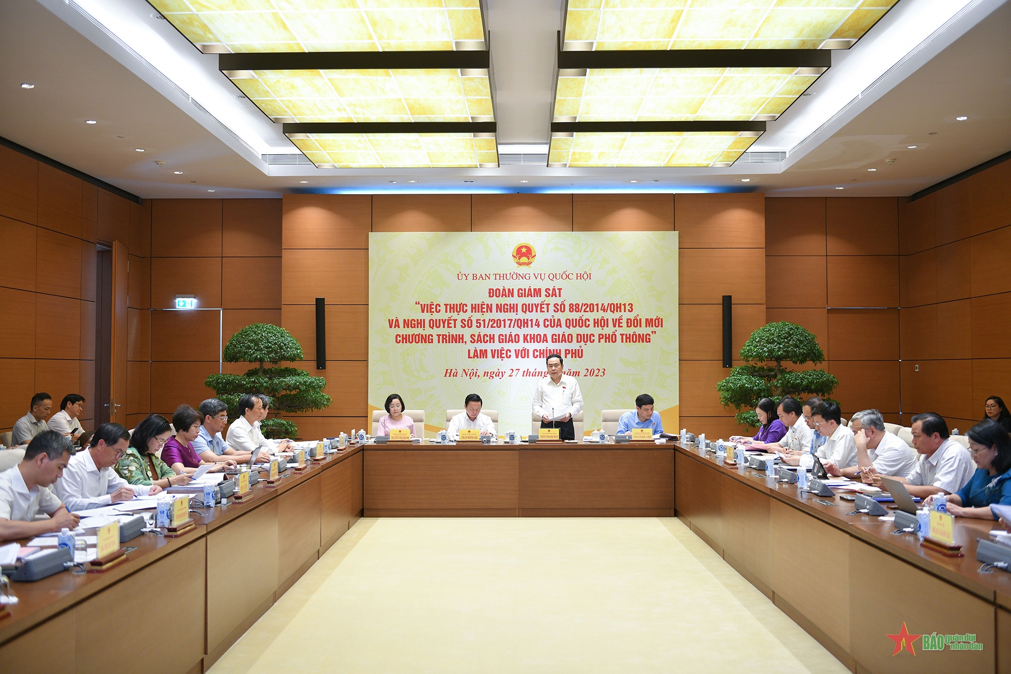 Từ trên xuống dưới, từ trái qua phải: Đoàn giám sát của Ủy ban Thường vụ Quốc hội về "Việc thực hiện Nghị quyết số 88/2014/QH13 và Nghị quyết số 51/2017/QH14 của Quốc hội về đổi mới chương trình, sách giáo khoa giáo dục phổ thông" làm việc với Chính phủ ngày 27-7-2023; Ngày 4-3-2022, Đoàn giám sát của Quốc hội đã có cuộc làm việc với Bộ Kế hoạch và Đầu tư (nay là Bộ Tài chính) về "Thực hiện chính sách, pháp luật về công tác quy hoạch kể từ khi Luật Quy hoạch có hiệu lực"; Đoàn giám sát của Ủy ban Thường vụ Quốc hội về việc thực hiện chính sách, pháp luật về phát triển và sử dụng nguồn nhân lực đáp ứng yêu cầu phát triển kinh tế - xã hội, nhất là nguồn nhân lực chất lượng cao giai đoạn 2021-2024 làm việc với Chính phủ.