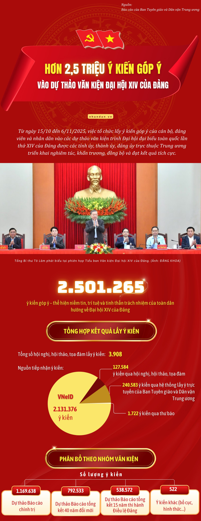 Bước đầu thể hiện rõ nét là việc công bố toàn văn dự thảo các văn kiện trình Đại hội XIV và cùng với đó là chiến dịch lấy ý kiến rộng khắp từ cán bộ, đảng viên đến nhân dân từ ngày 15-10 đến 15-11-2025. Theo báo cáo tổng hợp của Ban Tuyên giáo và Dân vận Trung ương, hơn 2,5 triệu lượt ý kiến đóng góp đã được ghi nhận, trong đó có gần 3.908 hội nghị tọa đàm, hơn 2,1 triệu ý kiến thông qua ứng dụng VNeID và hàng trăm nghìn ý kiến gửi qua các kênh trực tuyến khác. Những con số này không chỉ phản ánh quy mô lớn mà còn cho thấy sự quan tâm sâu sắc của toàn xã hội đối với các định hướng phát triển của đất nước.