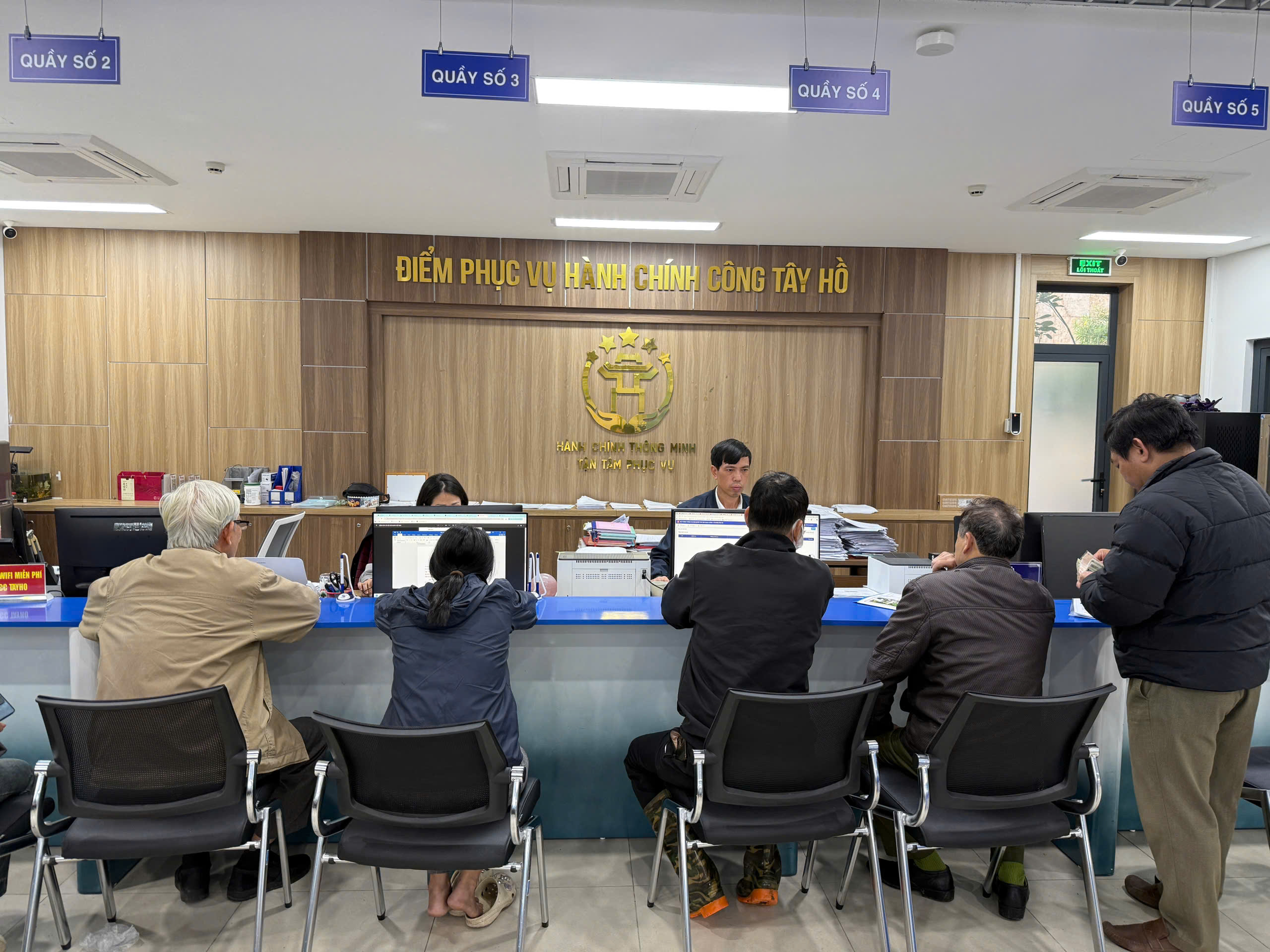 Chúng tôi có mặt tại Điểm phục vụ hành chính công phường Tây Hồ vào đầu giờ làm việc buổi chiều trong tiết trời mưa lạnh. Bốn dãy ghế chờ đã kín người. Thế nhưng, quy trình tiếp nhận hồ sơ vẫn vận hành nhịp nhàng.