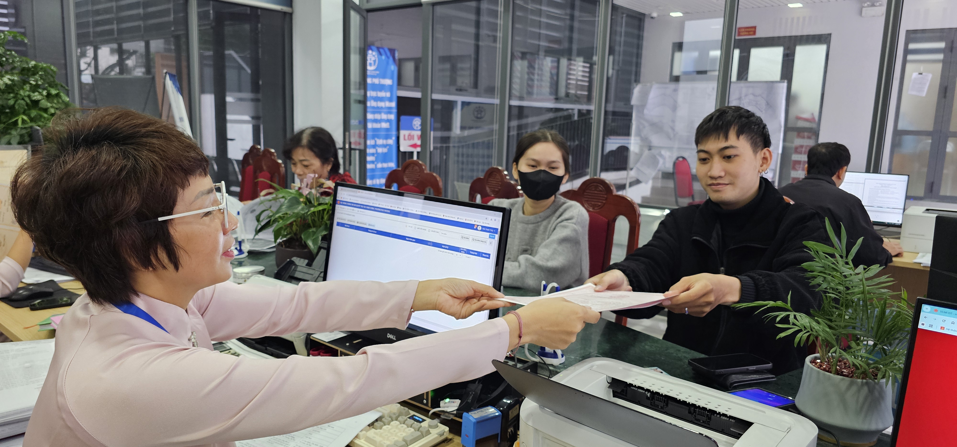 Tiếp theo, họ được hướng dẫn đến đúng bộ phận xử lý hồ sơ mà không phải mất thời gian loay hoay tìm hiểu. Tại quầy, toàn bộ thao tác của công chức đều hiển thị trên màn hình máy tính đối diện, giúp người dân theo dõi trực tiếp, kịp thời kiểm tra và chỉnh sửa nếu có sai sót.