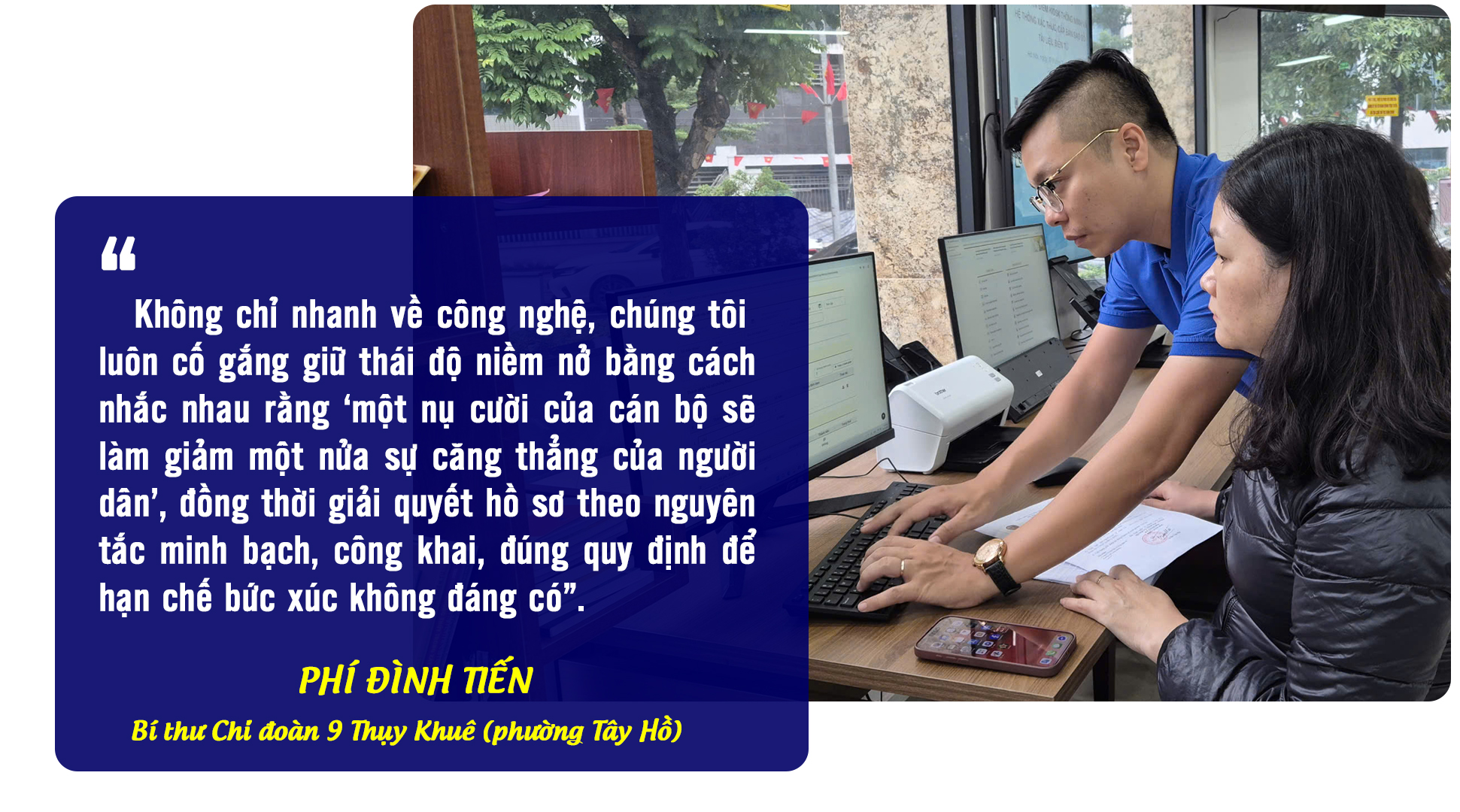 Chị Phan Thị Hồng (phường Tây Hồ) cho biết, là một kiểm toán viên, chị hiểu thế nào là cao điểm áp lực công việc. Vì vậy, chị càng cảm nhận rõ sự vất vả của đội ngũ công chức khi hằng ngày phải tiếp đón nhiều lượt công dân, đặc biệt là người lớn tuổi còn hạn chế về công nghệ. “Có người vừa được hướng dẫn kích hoạt VNeID xong, chỉ vài phút sau đã quên; hồ sơ sai phải sửa đi sửa lại; nhiều người không nhớ mật khẩu, không phân biệt nổi các ứng dụng…”, chị kể và cho biết ngay bản thân chị hỗ trợ bố mẹ, người thân còn thấy khó, huống chi cán bộ phải hướng dẫn liên tục cả ngày với hàng chục trường hợp như vậy. “Tôi thấy đây đúng là một cuộc cách mạng. Các chuyên viên ở đây đang đi vào guồng. Ngoài am hiểu chuyên môn, các kỹ năng số cũng nâng cao rất nhiều. Nếu không sẽ khó có thể tiếp nhận và giải quyết được số lượng hồ sơ lớn như thế trong ngày”, chị Hồng nói.