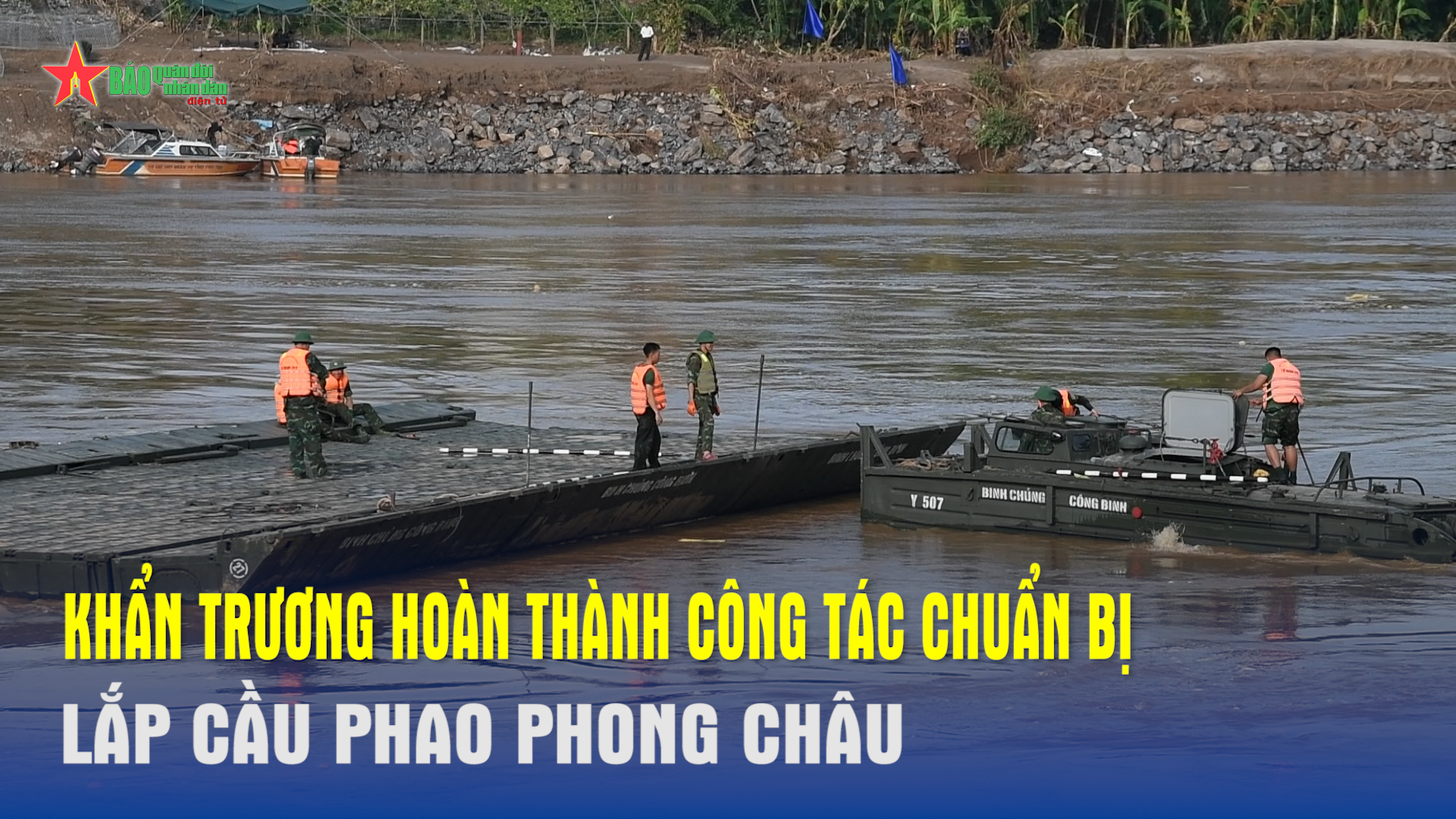 Chiều 21-9, Lữ đoàn Công binh Vượt sông 249, Binh chủng Công binh đang khẩn trương thi công hoàn thành công tác chuẩn bị lắp cầu phao Phong Châu (Phú Thọ), phục vụ nhân dân trong vùng sớm đi lại, sinh hoạt.