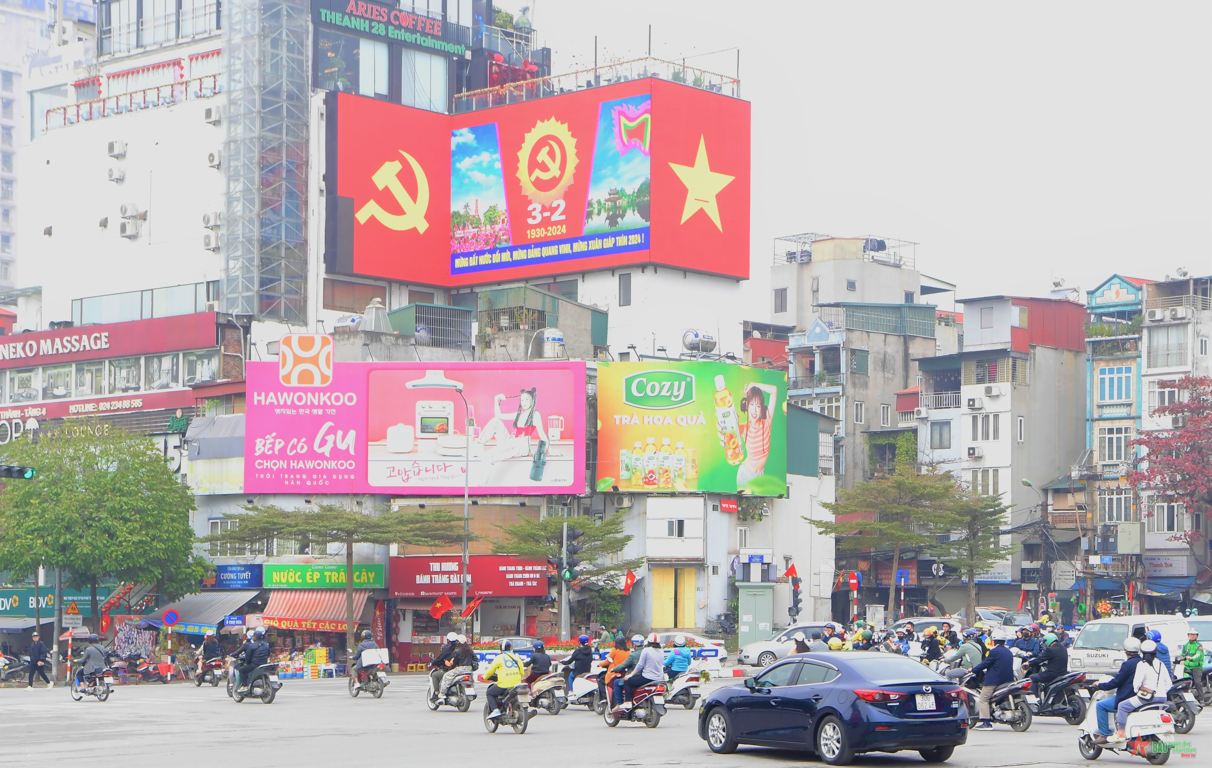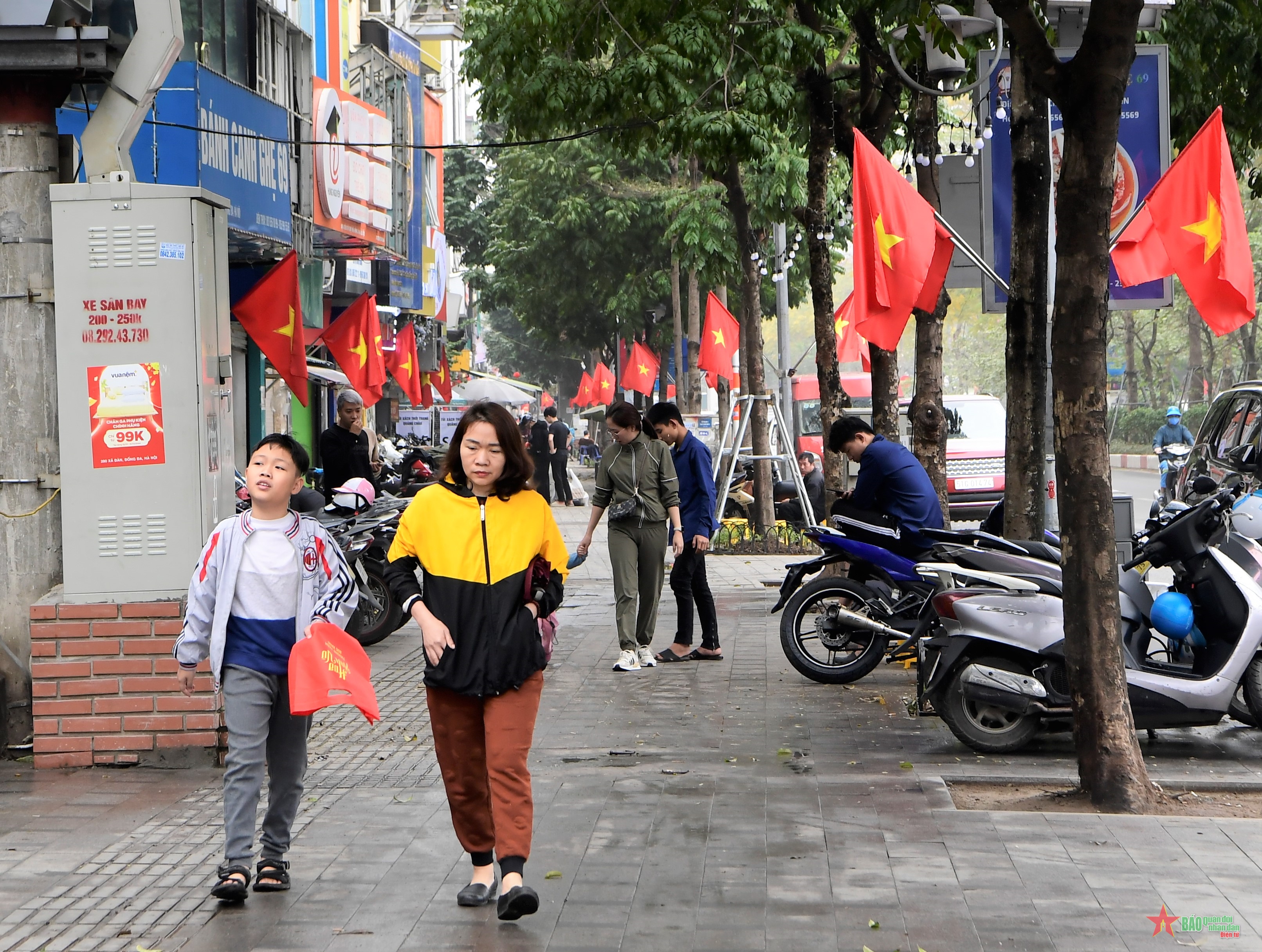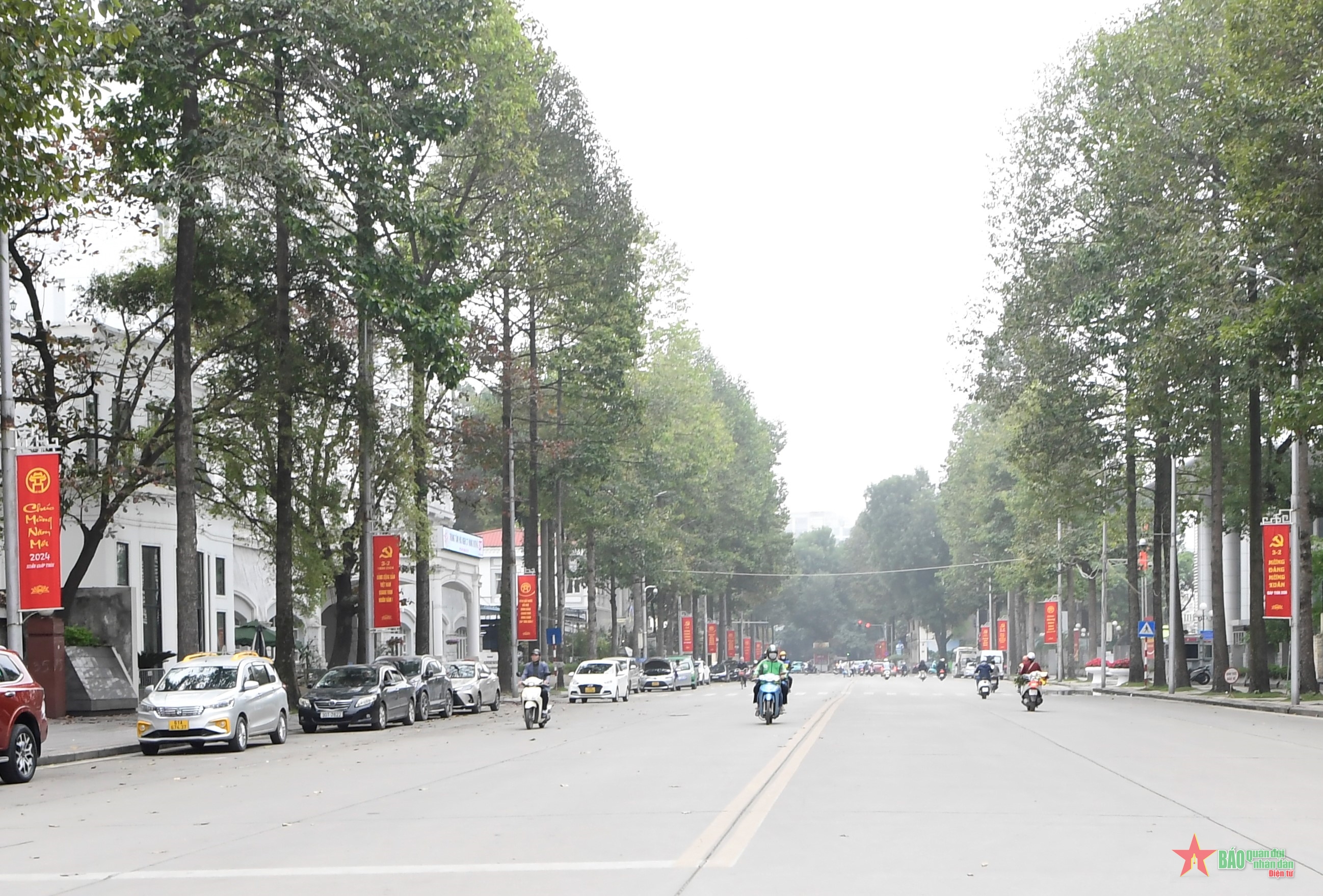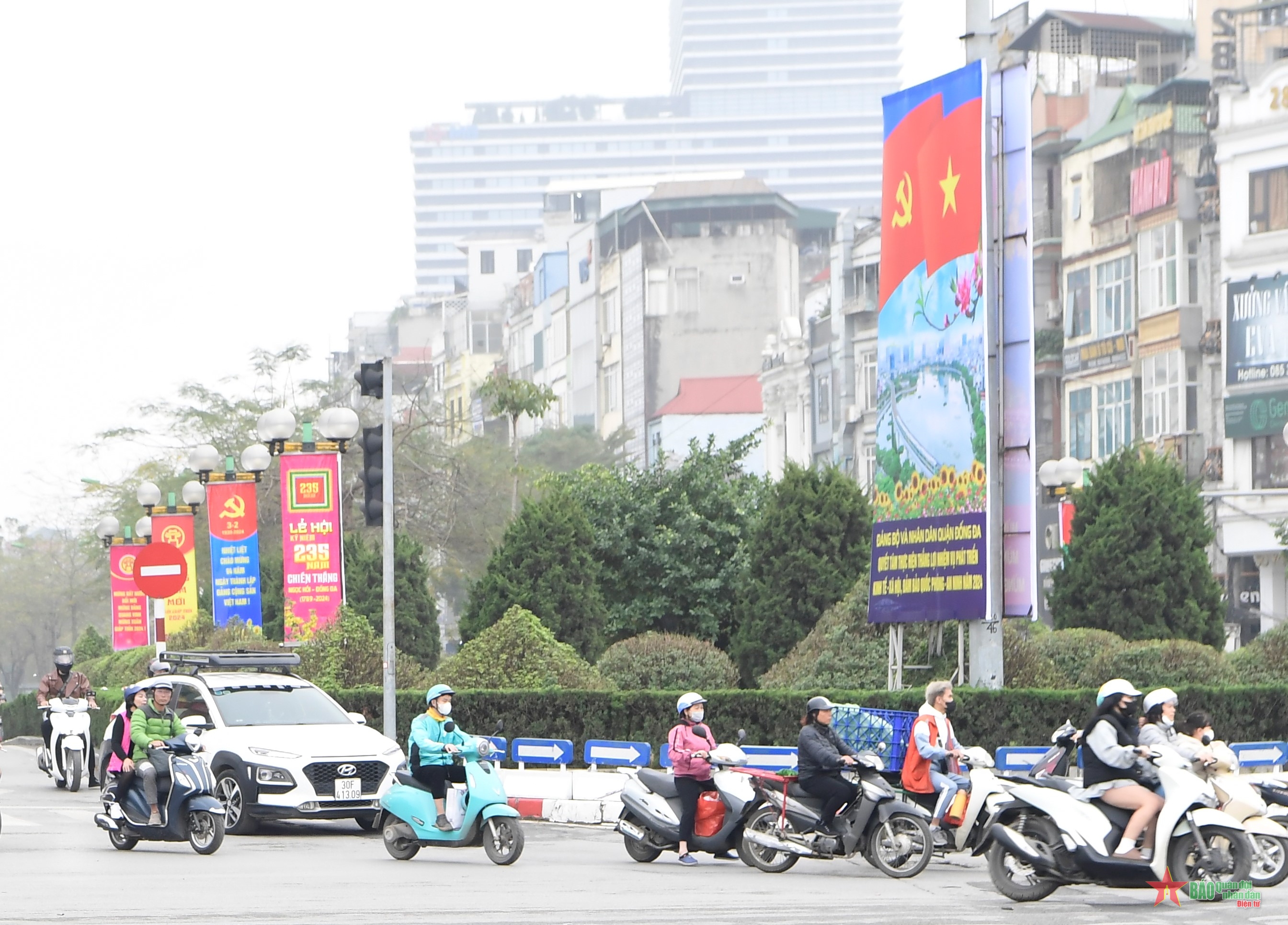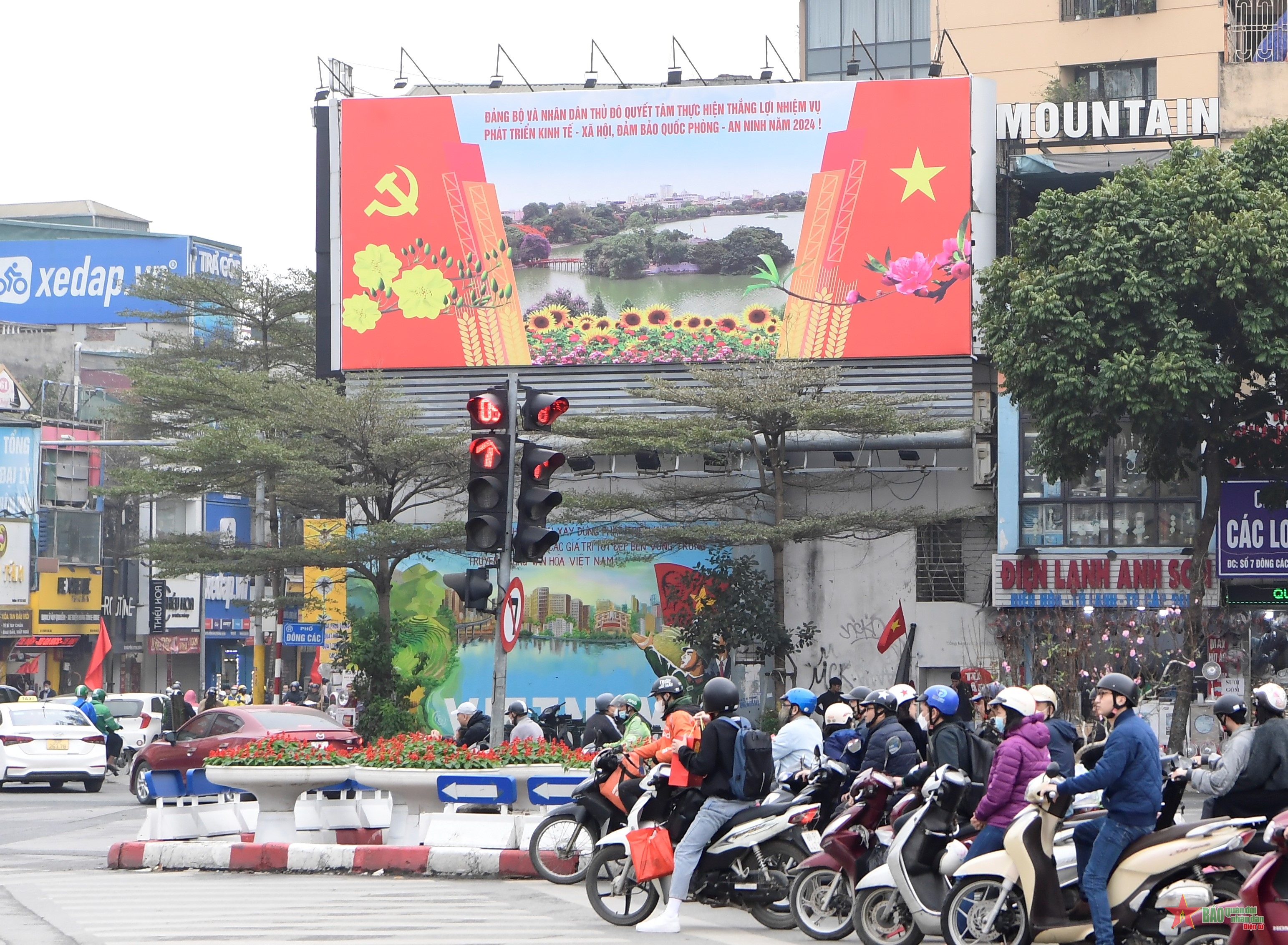 Băng rôn, cờ hoa với khẩu hiệu "Mừng Đảng - mừng Xuân", "Năm mới - Thời cơ mới-Thắng lợi mới"... nhuộm đỏ các tuyến phố trung tâm Hà Nội