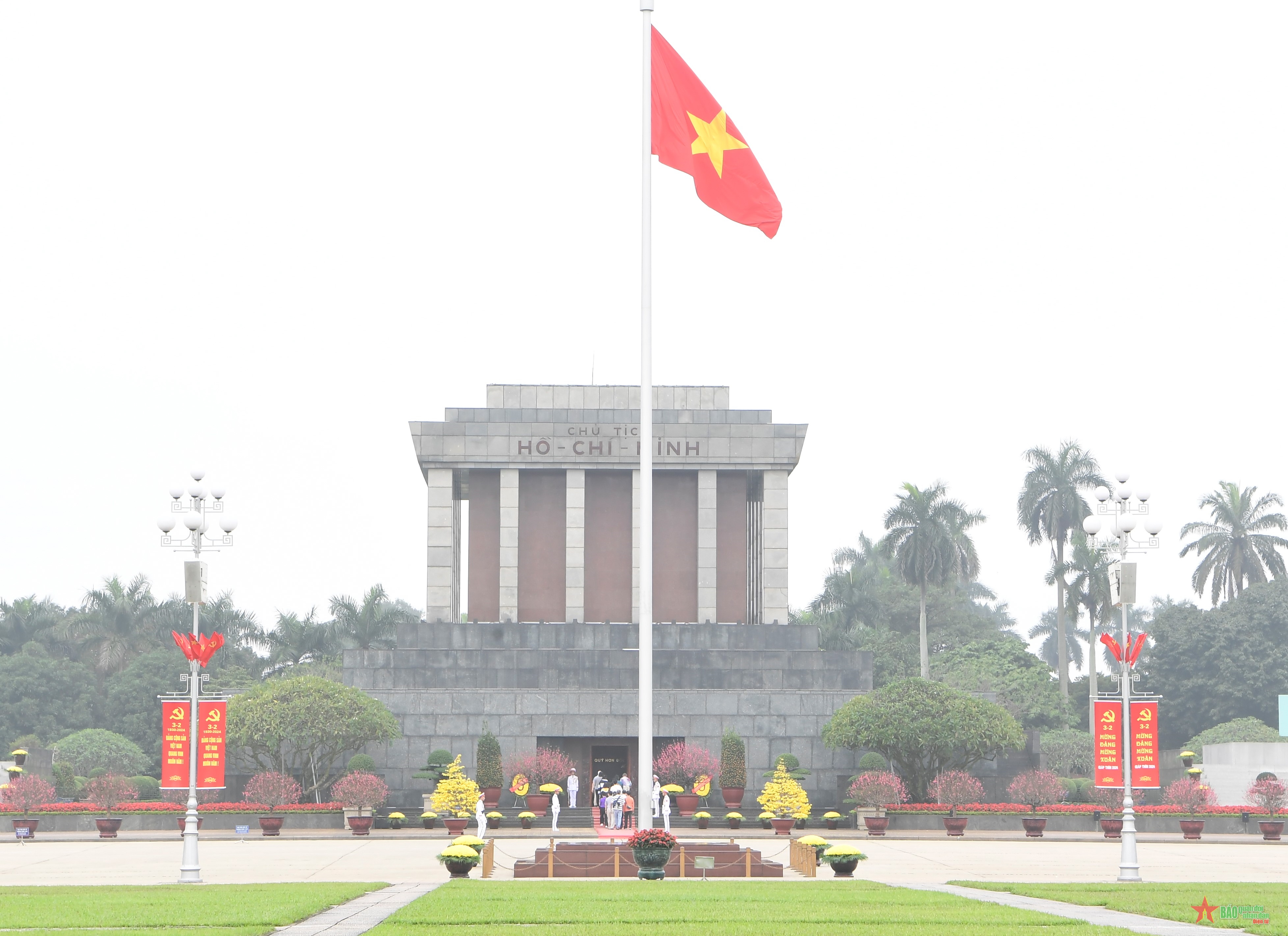 Quảng trường Ba Đình rực rỡ cờ đỏ sao vàng, cờ Đảng, băng rôn tuyên truyền mừng Đảng, mừng Xuân.