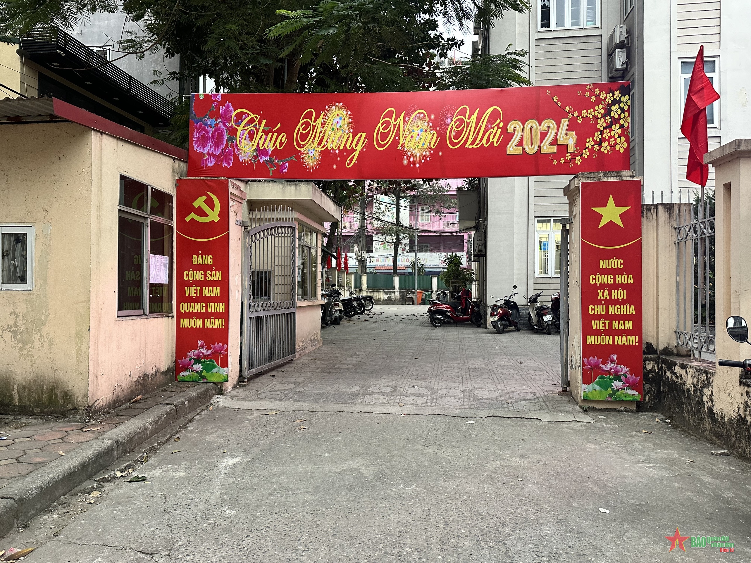 Pano cổ động tuyên truyền mừng Đảng, mừng xuân tại Trụ sở UBND phường Bưởi, quận Tây Hồ.