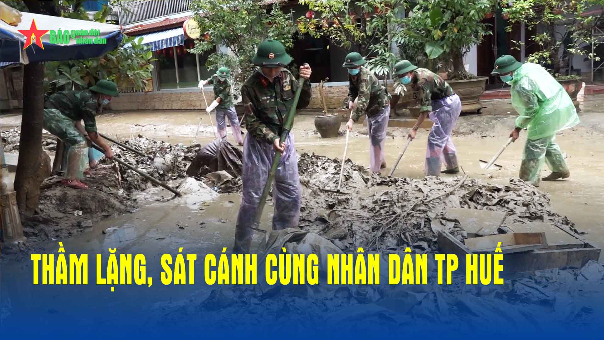 Các cán bộ, chiến sĩ Sư đoàn 968, Quân khu 4 cùng lực lượng dân quân địa phương đã kịp thời có mặt, khẩn trương giúp nhân dân thành phố Huế thu dọn bùn đất, rác thải sau bão số 13.