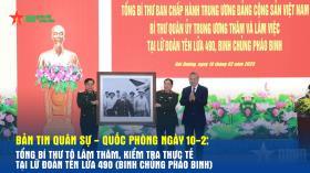 Bản tin hôm nay ngày 10-2 sẽ có những nội dung chính sau đây: Tổng Bí thư Tô Lâm thăm, kiểm tra thực tế tại Lữ đoàn Tên lửa 490 (Binh chủng Pháo binh); Bàn giao Tổng cục Hậu cần về Tổng cục Hậu cần-Kỹ thuật; Tư lệnh Quân khu 9 kiểm tra công tác chuẩn bị giao nhận quân tại Cần Thơ; Ấn Độ thay thế tên lửa không đối không R-77 bằng R-37M...