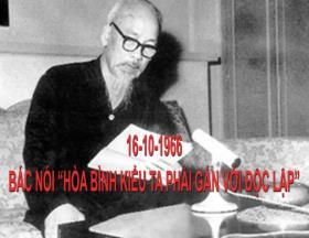 Ngày 16-10-1966, dự cuộc họp của Bộ Chính trị bàn về cách mạng miền Nam, Bác đề nghị dứt khoát đòi hòa bình và độc lập dân tộc. Hòa bình kiểu ta phải gắn với độc lập, không phải hòa bình kiểu Mỹ.