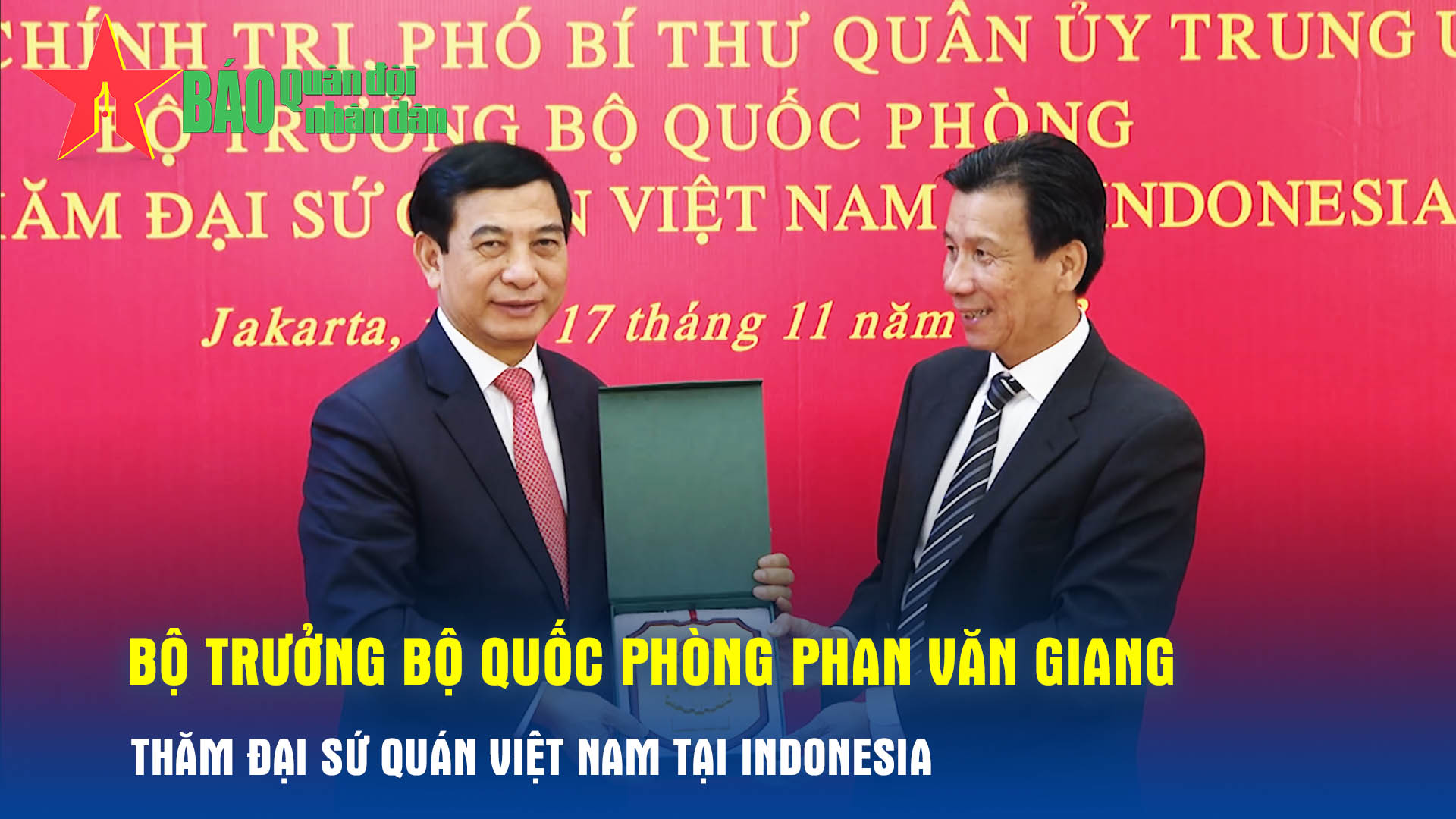 Sáng 17-11, tại Thủ đô Jakarta (Indonesia), Đại tướng Phan Văn Giang, Ủy viên Bộ Chính trị, Phó bí thư Quân ủy Trung ương, Bộ trưởng Bộ Quốc phòng và đoàn đại biểu Bộ Quốc phòng Việt Nam đã tới thăm Đại sứ quán Việt Nam tại Indonesia.