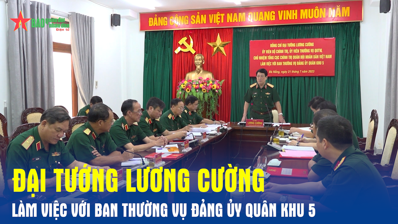 Đại tướng Lương Cường, Ủy viên Bộ Chính trị, Ủy viên Thường vụ Quân ủy Trung ương, Chủ nhiệm Tổng cục Chính trị Quân đội nhân dân Việt Nam chủ trì làm việc với Ban Thường vụ Đảng ủy Quân khu 5 về kết quả thực hiện nhiệm vụ quân sự, quốc phòng từ đầu năm 2023 đến nay.