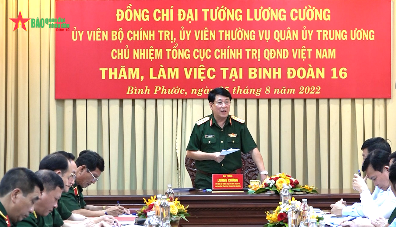 Chiều 25-8, Đại tướng Lương Cường, Ủy viên Bộ Chính trị, Ủy viên Thường vụ Quân ủy Trung ương, Chủ nhiệm Tổng cục Chính trị Quân đội nhân dân Việt Nam dẫn đầu đoàn công tác đến thăm và làm việc với Thường vụ Đảng ủy, Bộ tư lệnh Binh đoàn 16.