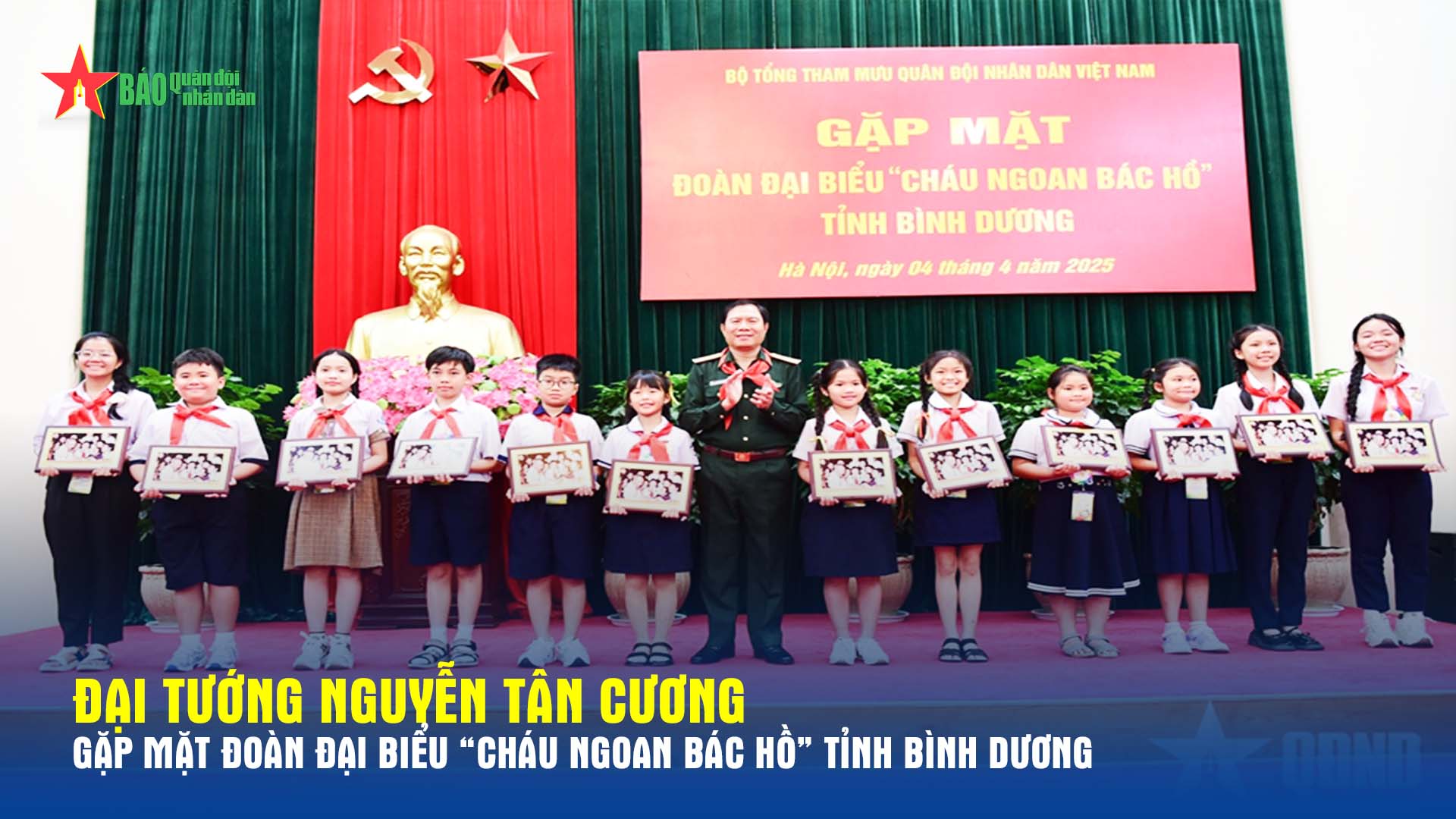Chiều 4-4, tại Hà Nội, Bộ Tổng Tham mưu (BTTM) Quân đội nhân dân Việt Nam tổ chức gặp mặt Đoàn đại biểu “Cháu ngoan Bác Hồ” tỉnh Bình Dương năm 2025. Đại tướng Nguyễn Tân Cương, Ủy viên Trung ương Đảng, Ủy viên Thường vụ Quân ủy Trung ương, Tổng Tham mưu trưởng QĐND Việt Nam, Thứ trưởng Bộ Quốc phòng chủ trì buổi gặp mặt.