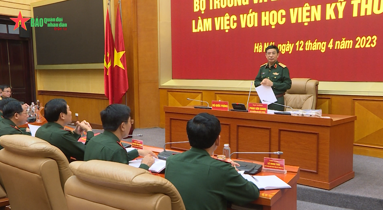 Sáng 12-4, tại Hà Nội, Đại tướng Phan Văn Giang, Ủy viên Bộ Chính trị, Phó bí thư Quân ủy Trung ương, Bộ trưởng Bộ Quốc phòng chủ trì làm việc với Học viện Kỹ thuật Quân sự.
