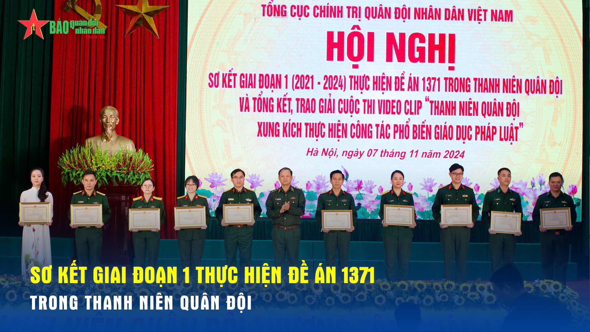 Sáng 7-11, tại Học viện Biên phòng, Tổng cục Chính trị Quân đội nhân dân (QĐND) Việt Nam tổ chức Hội nghị sơ kết giai đoạn 1 (2021-2024) thực hiện đề án 1371 trong Thanh niên Quân đội và Tổng kết, trao giải cuộc thi Video clip "Thanh niên Quân đội xung kích thực hiện công tác phổ biển, giáo dục pháp luật".