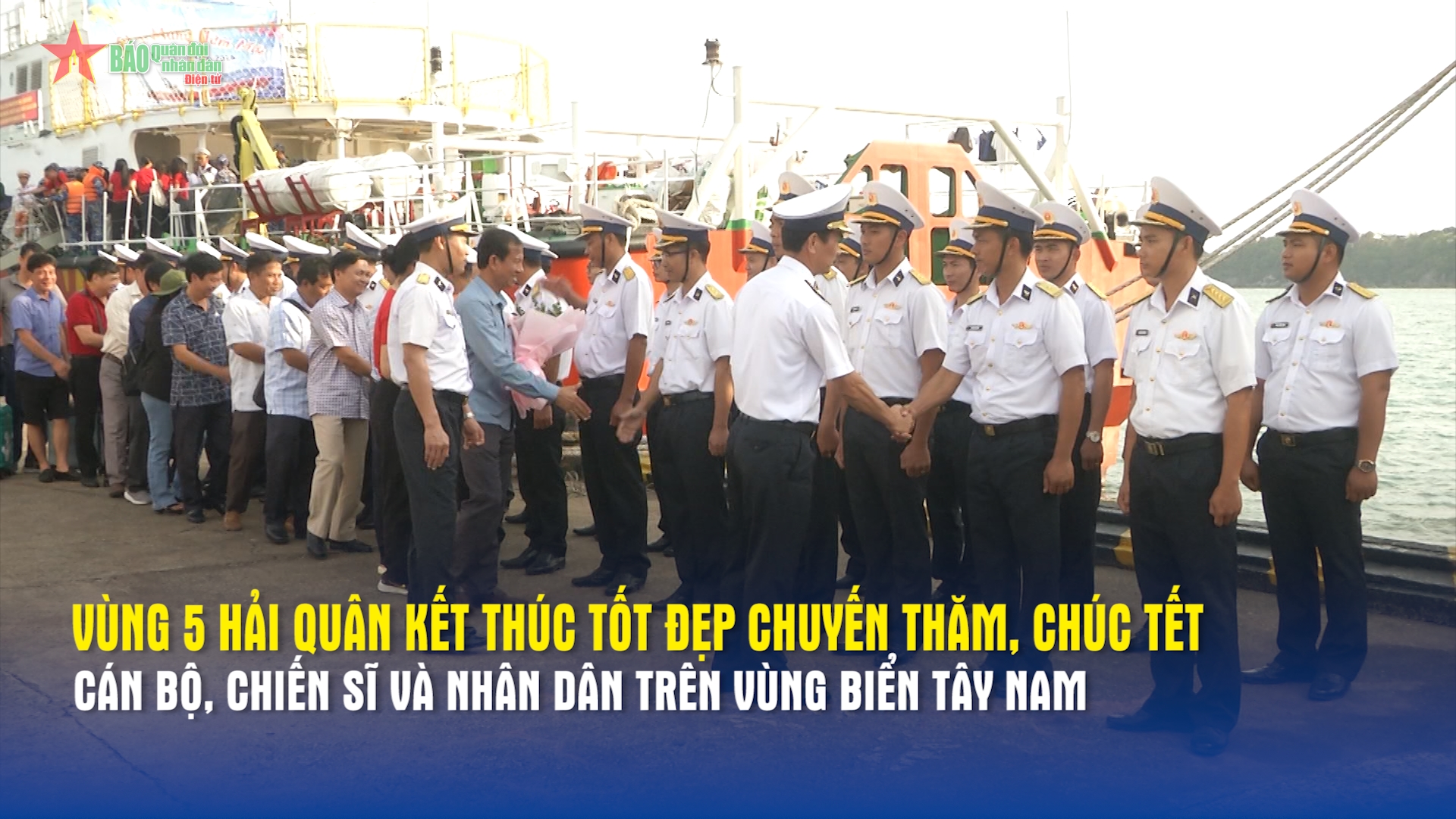 Sau hành trình 6 ngày 5 đêm vượt qua gần 500 hải lý, đến với 5 điểm đảo, đoàn công tác của Bộ tư lệnh Vùng 5 Hải quân, đoàn đại biểu các tỉnh, thành phố phía Nam, các doanh nghiệp và cơ quan báo chí đã cập cảng tại Phú Quốc, hoàn thành tốt đẹp chuyến thăm, động viên, chúc Tết cán bộ, chiến sĩ, các lực lượng và nhân dân trên vùng biển Tây Nam của Tổ quốc...