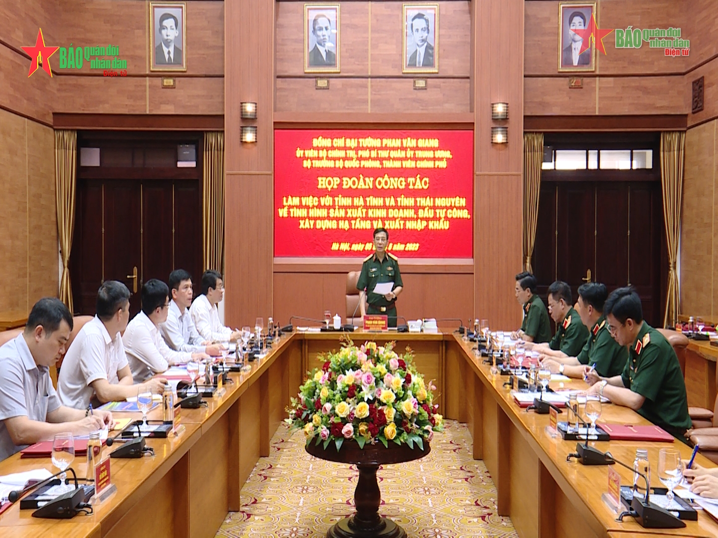 Chiều 5-5, tại Hà Nội, Đại tướng Phan Văn Giang, Ủy viên Bộ Chính trị, Phó bí thư Quân ủy Trung ương, Bộ trưởng Bộ Quốc phòng, thành viên Chính phủ chủ trì buổi họp đoàn công tác Chính phủ làm việc với tỉnh Hà Tĩnh và tỉnh Thái Nguyên về tình hình sản xuất kinh doanh, đầu tư công, xây dựng hạ tầng và xuất nhập khẩu.