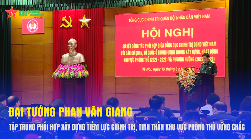 Chiều 15-8, Đại tướng Phan Văn Giang, Ủy viên Bộ Chính trị, Phó bí thư Quân ủy Trung ương, Bộ trưởng Bộ Quốc phòng, dự, phát biểu chỉ đạo Hội nghị sơ kết công tác phối hợp giữa Tổng cục Chính trị Quân đội nhân dân Việt Nam với các cơ quan, tổ chức ở Trung ương trong xây dựng, hoạt động khu vực phòng thủ giai đoạn 2021-2023 và phương hướng giai đoạn 2024-2026.