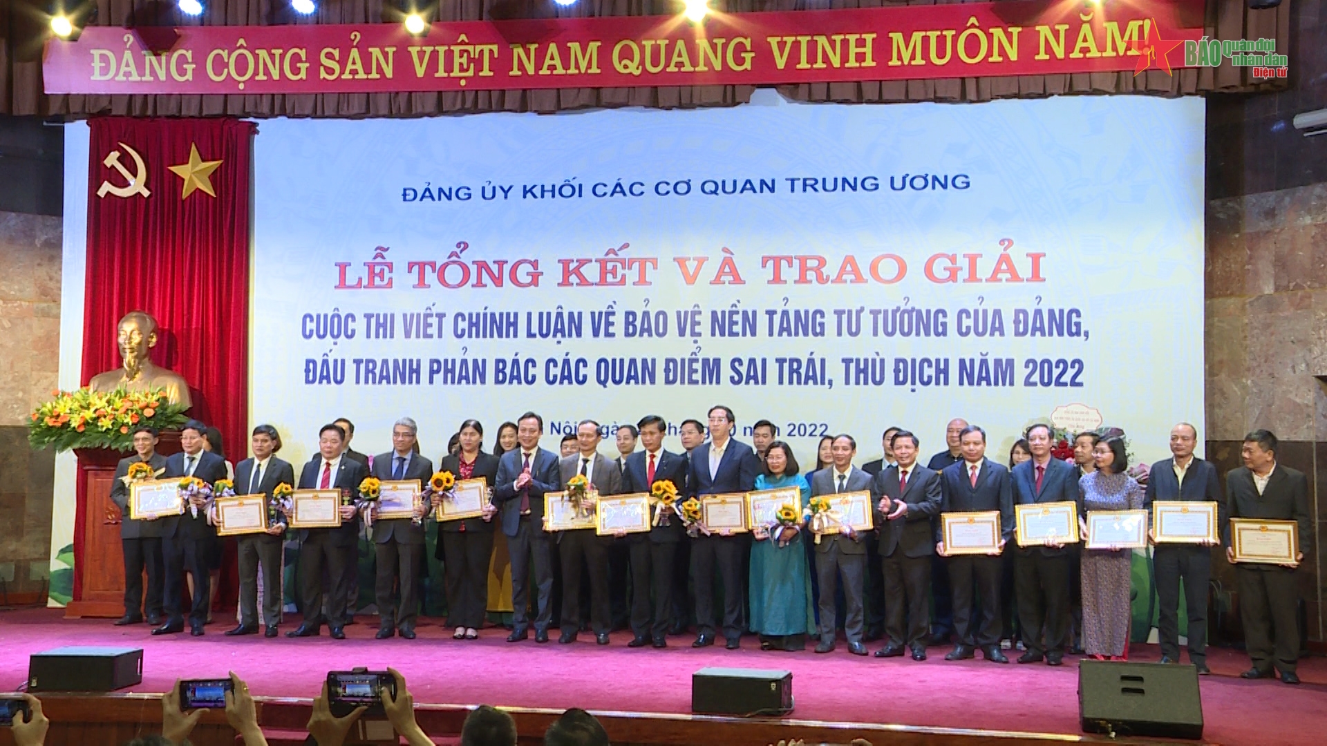 Tối 21-10, tại Hà Nội, Đảng ủy Khối các cơ quan Trung ương tổng kết và trao giải cuộc thi viết chính luận về bảo vệ nền tảng tư tưởng của Đảng, đấu tranh phản bác các quan điểm sai trái, thù địch năm 2022.