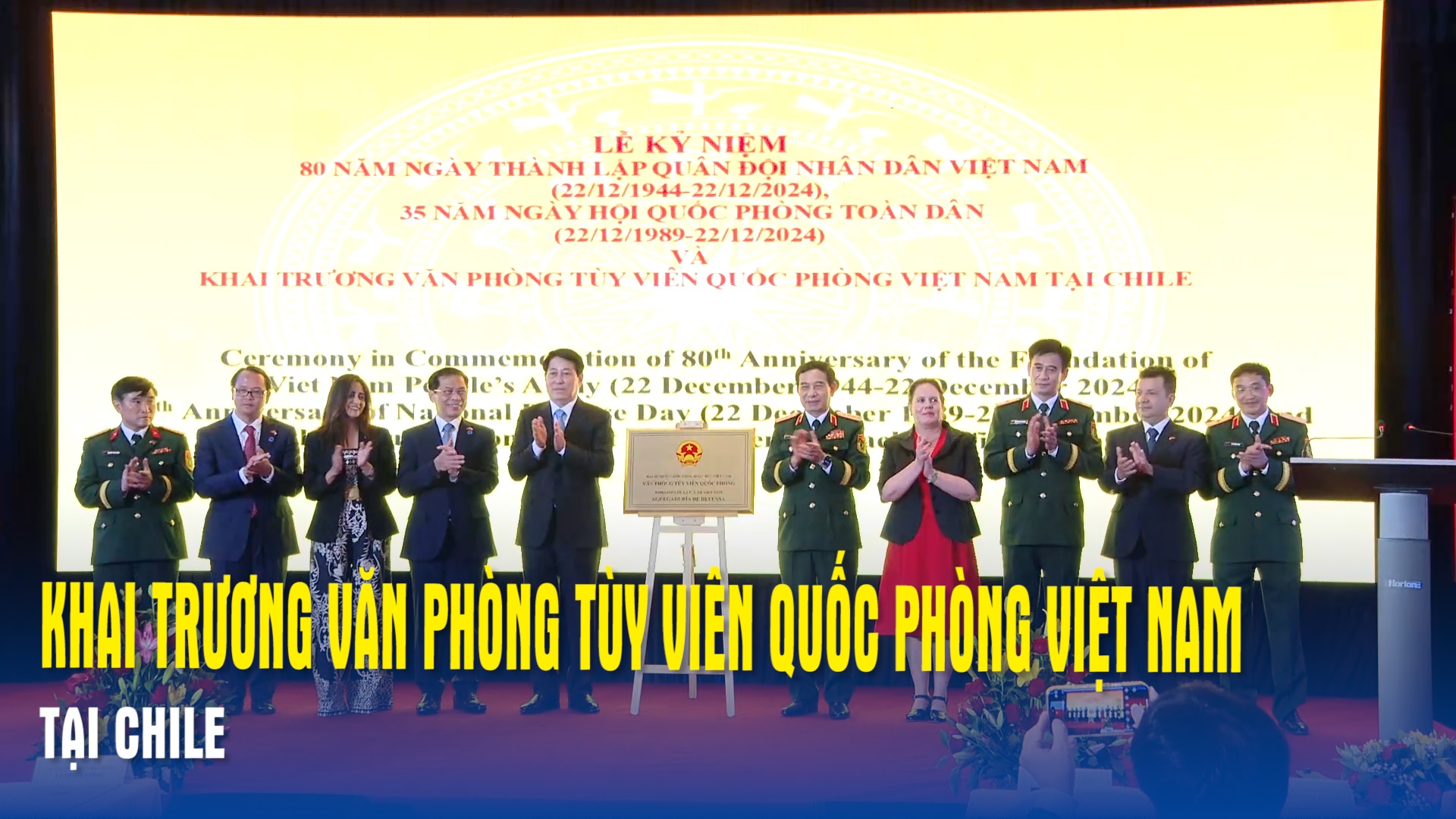 Tại Thủ đô Santiago, Bộ Quốc phòng Việt Nam tổ chức Lễ kỷ niệm 80 năm Ngày thành lập Quân đội nhân dân (QĐND) Việt Nam, 35 năm Ngày hội Quốc phòng toàn dân và công bố khai trương Văn phòng Tùy viên Quốc phòng Việt Nam tại Chile. Đại tướng Phan Văn Giang, Ủy viên Bộ Chính trị, Phó bí thư Quân ủy Trung ương, Bộ trưởng Bộ Quốc phòng chủ trì buổi lễ.