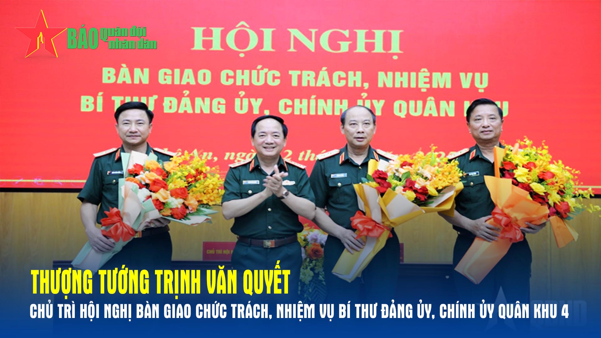 Ngày 12-5, tại Bộ tư lệnh Quân khu 4, Thượng tướng Trịnh Văn Quyết, Bí thư Trung ương Đảng, Ủy viên Thường vụ Quân ủy Trung ương, Chủ nhiệm Tổng cục Chính trị Quân đội nhân dân Việt Nam chủ trì Hội nghị bàn giao chức trách, nhiệm vụ Bí thư Đảng ủy, Chính ủy Quân khu 4.