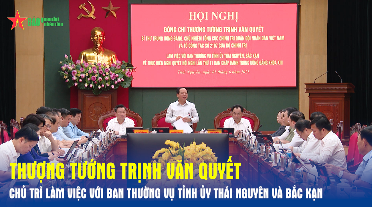 Sáng 5-6, tại Thái Nguyên, Thượng tướng Trịnh Văn Quyết, Bí thư Trung ương Đảng, Ủy viên Thường vụ Quân ủy Trung ương, Chủ nhiệm Tổng cục Chính trị Quân đội nhân dân (QĐND) Việt Nam và Tổ công tác 2107 của Bộ Chính trị làm việc với Ban Thường vụ Tỉnh ủy Thái Nguyên, Bắc Kạn về thực hiện Nghị quyết Hội nghị lần thứ 11 Ban Chấp hành Trung ương Đảng khóa XIII.