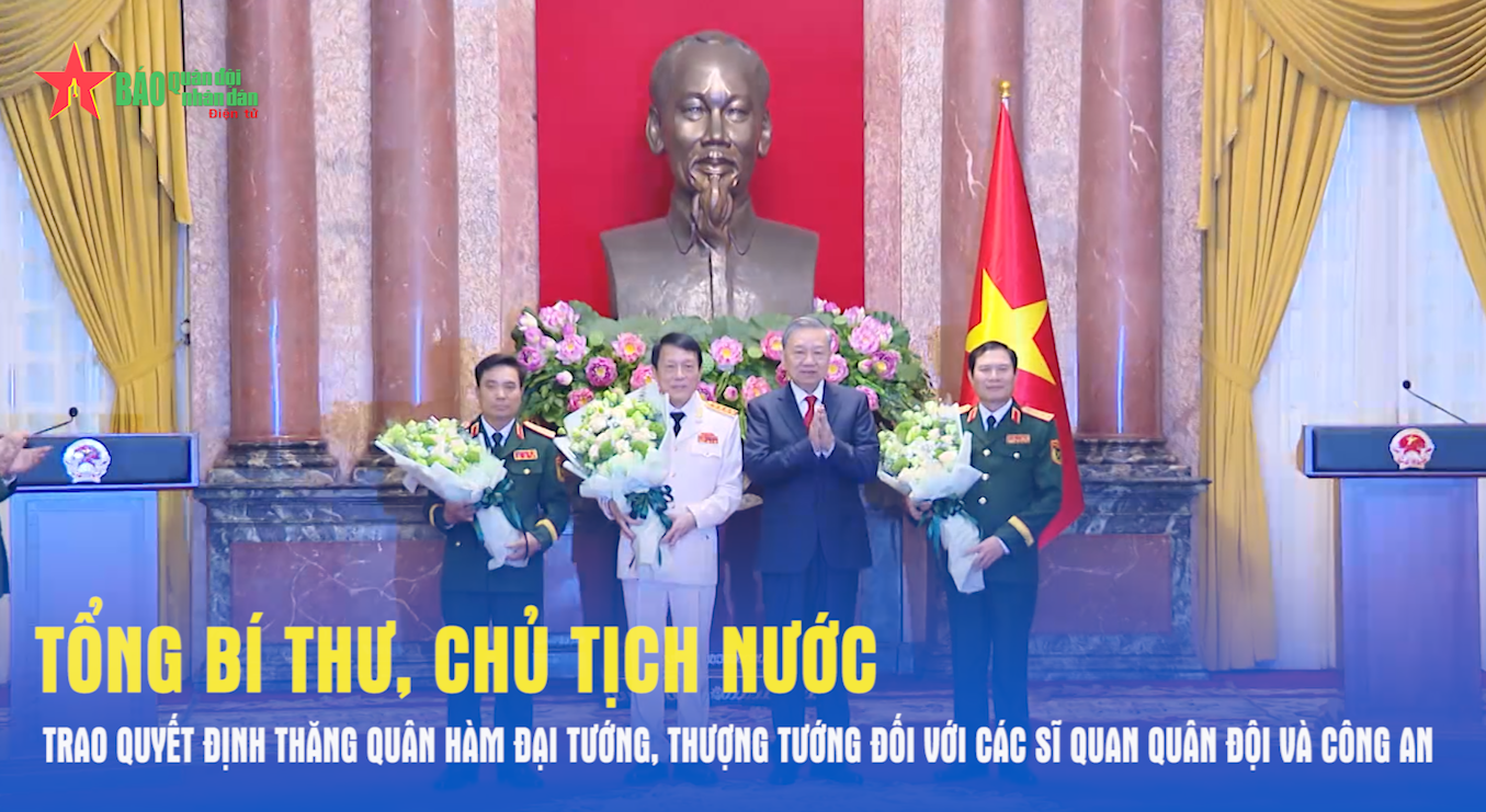 Chiều 20-10, tại Phủ Chủ tịch, Tổng Bí thư, Chủ tịch nước Tô Lâm, Thống lĩnh lực lượng vũ trang nhân dân, Chủ tịch Hội đồng Quốc phòng và An ninh đã trao quyết định thăng quân hàm từ Thượng tướng lên Đại tướng đối với đồng chí Lương Tam Quang và đồng chí Nguyễn Tân Cương.